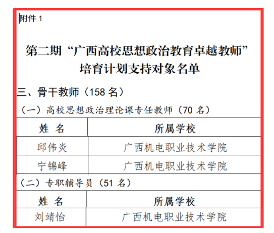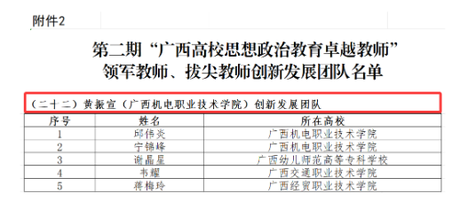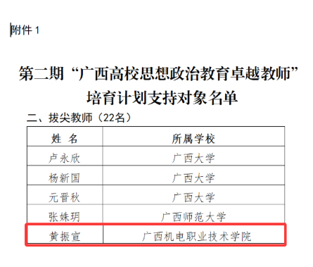 近日,自治区教育厅公布了第二期“广西高校思想政治教育卓越教师”培育计划支持对象名单,万象城官网共有4名教师入选。黄振宣入选“拔尖教师”(全区高职高专院校共2人入选),并获批牵头联合广西幼儿师范高等专科学校、广西交通职业技术学院、广西经贸职业技术学院成立“黄振宣(awc77万象城官网)广西高校思想政治教育创新发展团队”;先进制造技术学院刘靖怡、马克思主义学院邱伟炎和宁锦峰老师入选专职辅导员、思政课专任教师等系列“骨干教师”。