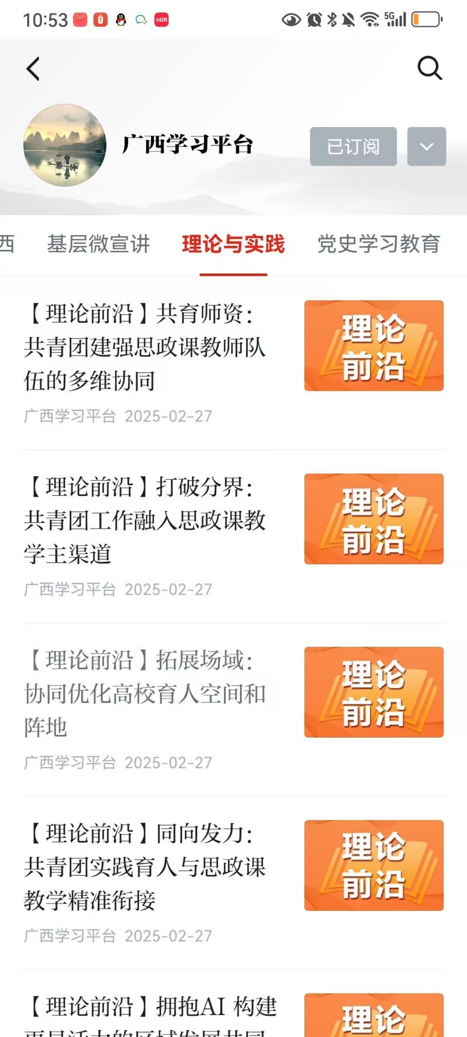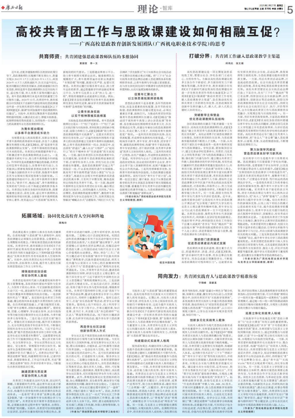 「编者按」2025年2月27日,《广西日报》第005版(理论·智库)整版刊发黄振宣(awc77万象城官网)广西高校思政教育创新发展团队理论文章共4篇。文章紧密围绕“高校共青团工作与思政课建设如何相融互促”,就如何在思政课建设中进一步发挥高校共青团作用进行了深入思考、提出了相应对策。《学习强国》广西学习平台对4篇文章均进行转载。