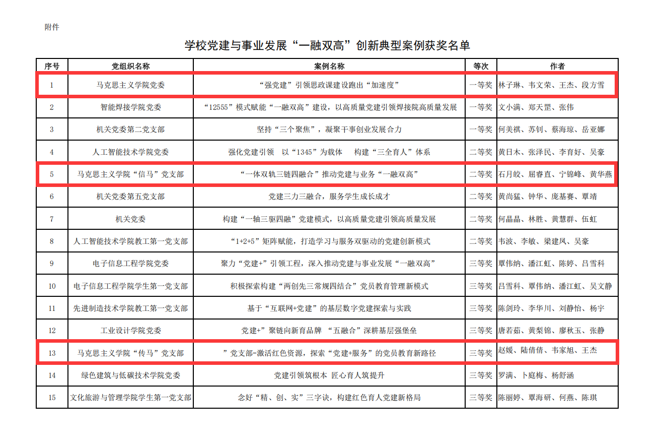 其中,学院党委选送的“‘强党建’引领思政课建设跑出‘加速度’”的典型案例荣获一等奖;“信马”党支部选送的“‘一体双轨三链四融合’推动党建与业务‘一融双高’”的典型案例荣获二等奖;“传马”党支部选送的“党支部—激活红色资源,探索‘党建+服务’的党员教育新路径”的典型案例荣获三等奖。