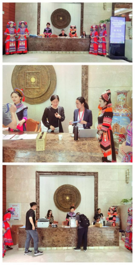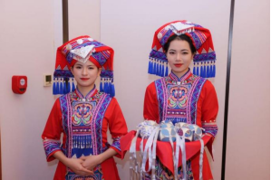 青年教师与学生身着壮族、瑶族、毛南族等民族传统服饰,整齐列队迎接前来参会的专家与参赛教师,以规范的礼仪和热忱的态度,展现广西“三月三”传统节日的热情好客风貌。