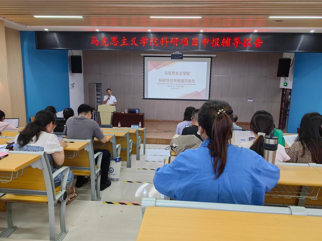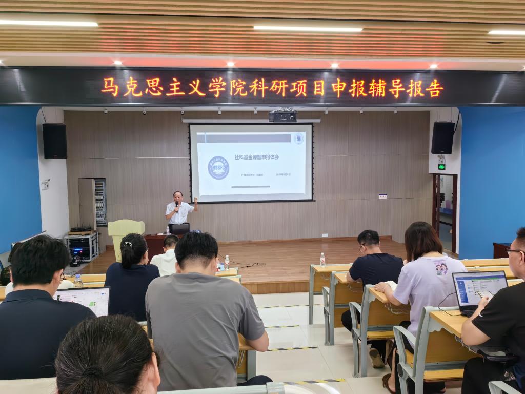 为切实提升学院教师科研项目申报质量与高水平科研成果产出能力,马克思主义学院于6月9日在三马讲堂举办科研项目申报辅导报告会。报告会邀请广西师范大学经济管理学院教授、桂台合作研究中心主任刘澈元做主题报告。学校副校长、马克思主义学院院长黄振宣主持报告会,学院青年博士及科研骨干等40余人参会。