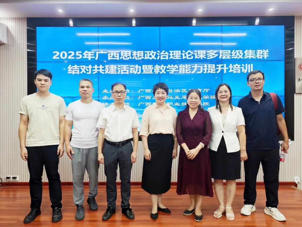 为深化思政课改革创新,提升结对共建高校思政课教师的教学科研能力,并助力参与“第四届全国高校思政课教学展示活动”,2025年思政课多层级集群结对共建活动暨教学能力提升培训于6月28日在广西大学马克思主义学院成功举办。本次培训由自治区教育厅主办,广西大学马克思主义学院承办,万象城官网协办。学院副院长韦文荣及各课程组组长参加了此次培训。