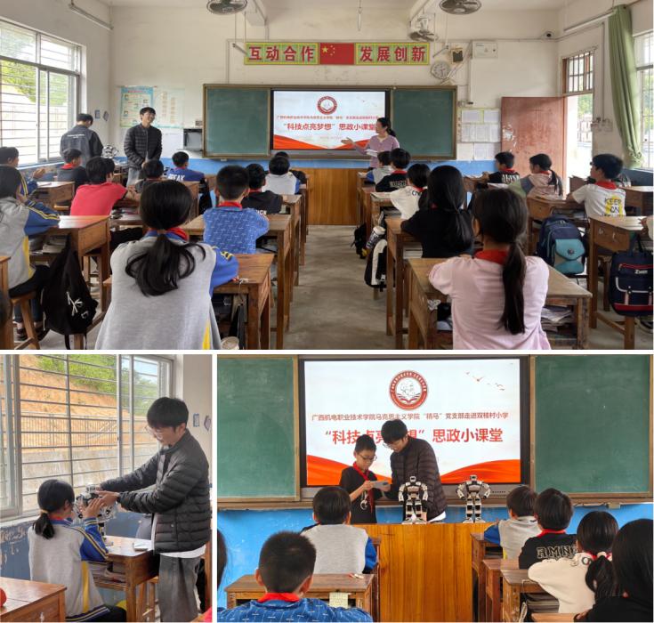在双桂村,“精马”党支部联合人工智能技术学院教师,面向乡村学生开展了一场别开生面的“科技强国与少年担当”现场教学。“精马”支部书记黄春梅主持活动,人工智能专业教师刘泽宇从孩子们熟悉的智能手机、语音助手切入,将高深的前沿技术化为通俗易懂的生活语言,娓娓道出人工智能如何重塑社会生产与日常生活,引导孩子们理解“科技何以强国、何以惠民”的深刻命题。随着讲解深入,机器人同步演示各项指令动作,精准响应、灵活运作,引得满堂惊叹与掌声不断,抽象的科技概念在孩子们眼中化作真实可感的未来图景。