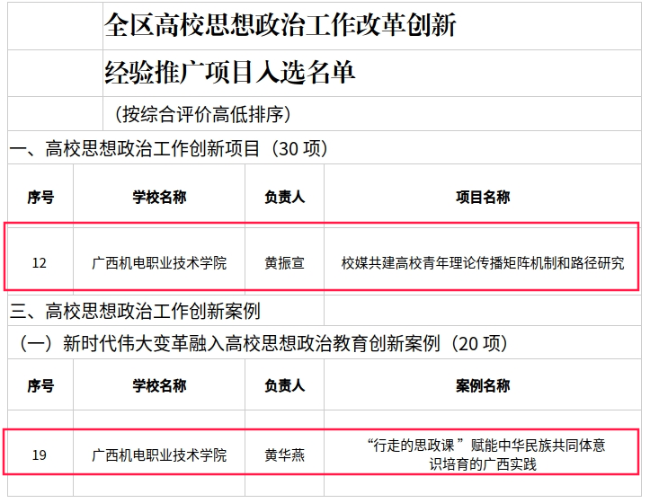 此次入选的两项成果分别为:黄振宣团队申报的《校媒共建高校青年理论传播矩阵机制和路径研究》、黄华燕团队申报的《“行走的思政课”赋能中华民族共同体意识培育的广西实践》。前者聚焦校媒协同机制,探索青年理论传播的新路径,入选“高校思想政治工作创新项目”;后者立足广西地域特色,通过实践教学深化铸牢中华民族共同体意识教育,入选“新时代伟大变革融入高校思想政治教育创新案例”。