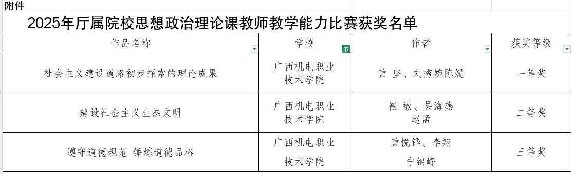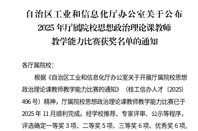 近日,自治区工业和信息化厅办公室公布了2025年厅属院校思想政治理论课教师教学能力比赛获奖名单。万象城官网选送的3个作品,分别荣获一等奖、二等奖、三等奖各1项。