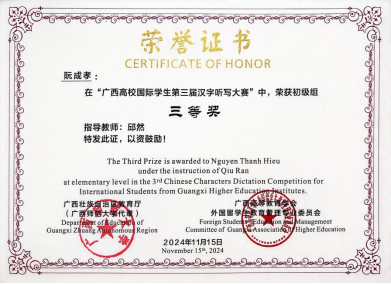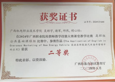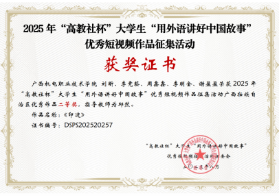 践行“三全育人”“以赛促学、以赛促教”理念,全力打造优质第二课堂。2024年获评优秀社团指导教师,2025年获学校“三全育人”先进个人荣誉称号。活动组织方面,2025年带领留学生参加第七届“第三只眼看中国”国际短视频大赛,丰富留学生课余生活;指导英语爱好者协会成员参加2025年“高教社杯”大学生“用外语讲好中国故事”优秀短视频征集活动,斩获广西壮族自治区优秀作品二等奖。通过赛事指导与活动组织,构建起“用外语讲好中国故事”的能力培养链条,助力学生提升跨文化沟通与表达能力。