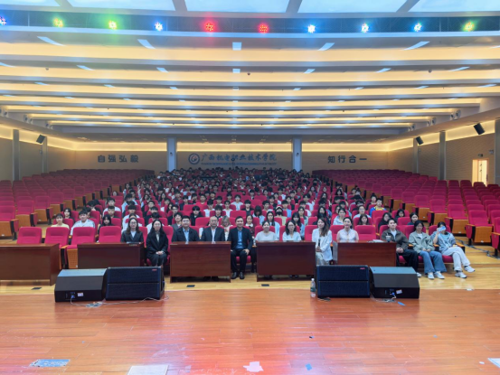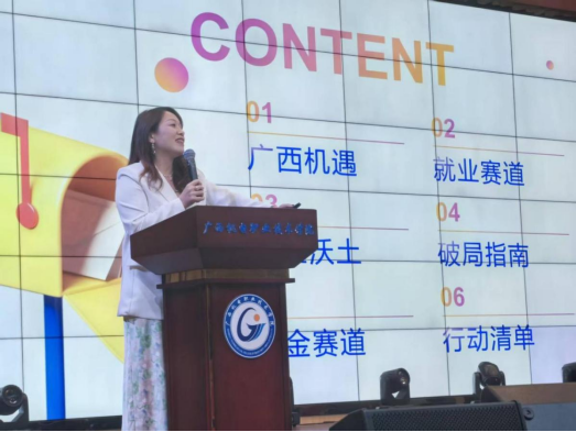 随后,资深双创导师颜新秀以“桂机遇正青春,解锁大学生创业就业新机遇”为题进行分享。颜新秀在创新创业服务领域深耕10年,曾为上千家企业和百余个项目提供创业咨询服务,多次担任各级各类创业大赛导师与评委。她系统分析广西就业创业形势,解读“才聚广西”等四大就业计划及专项政策,重点介绍能源经济、跨境服务等新兴领域的发展机遇,同时分享多个创业成功案例。她指出,提升核心能力是职业发展的关键,并给同学们提供了实用的职业发展建议。