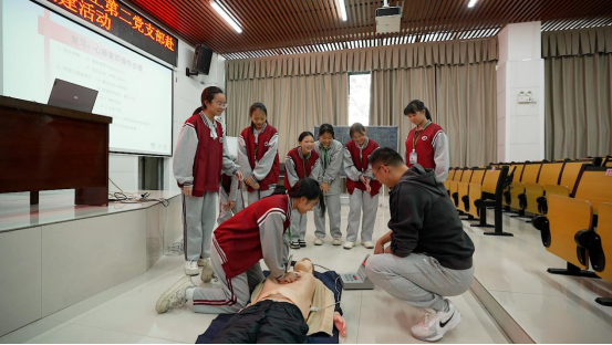 在桃花湾中学,支部党员教师充分发挥学科专业优势,聚焦生命安全教育,开展沉浸式急救技能培训。活动中,教师们详细讲解心肺复苏(CPR)操作要领和AED使用规范,并组织学生分组进行实操演练。同学们在模拟人上认真练习胸外按压、人工呼吸,并亲手操作AED设备,切实掌握“黄金四分钟”关键救援技能。同时,教师结合戍边卫国的真实案例开展爱国主义教育,引导青少年厚植家国情怀、增强责任意识。活动结束后,支部向学校捐赠篮球、跳绳、匹克球等体育器材,助力改善边疆学校体育教学条件,传递教育温暖。