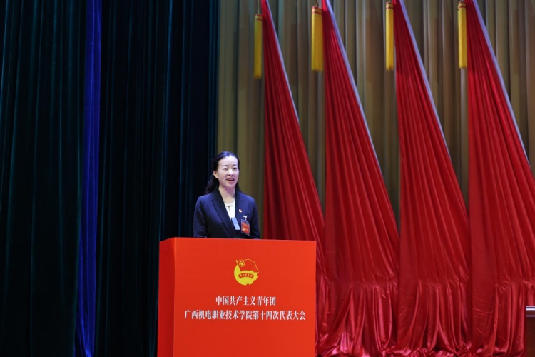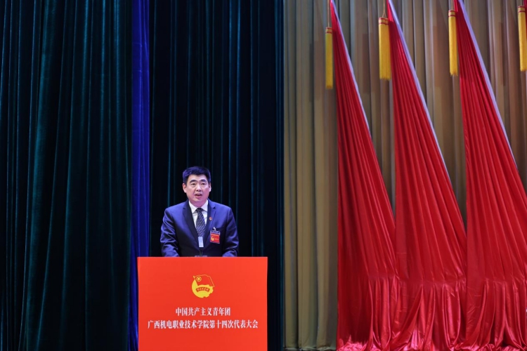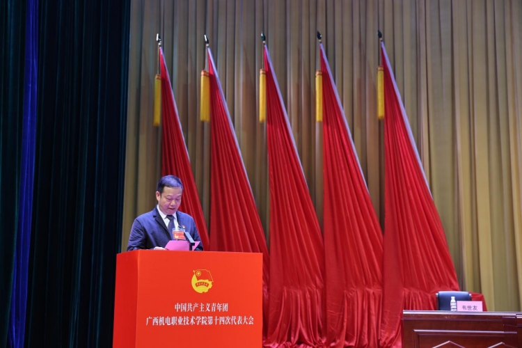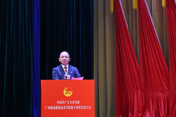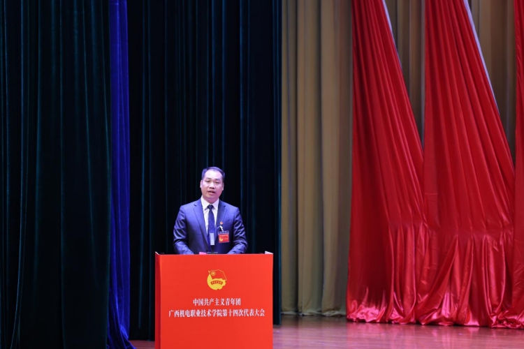 学校团委书记韦世友代表共青团awc77万象城官网第十三届委员会向大会作了题为《高举团旗跟党走 勇担使命建新功团结带领机电青年在争创广西领先、国内一流、国际知名高水平智能制造特色校中绽放青春光彩》的工作报告。