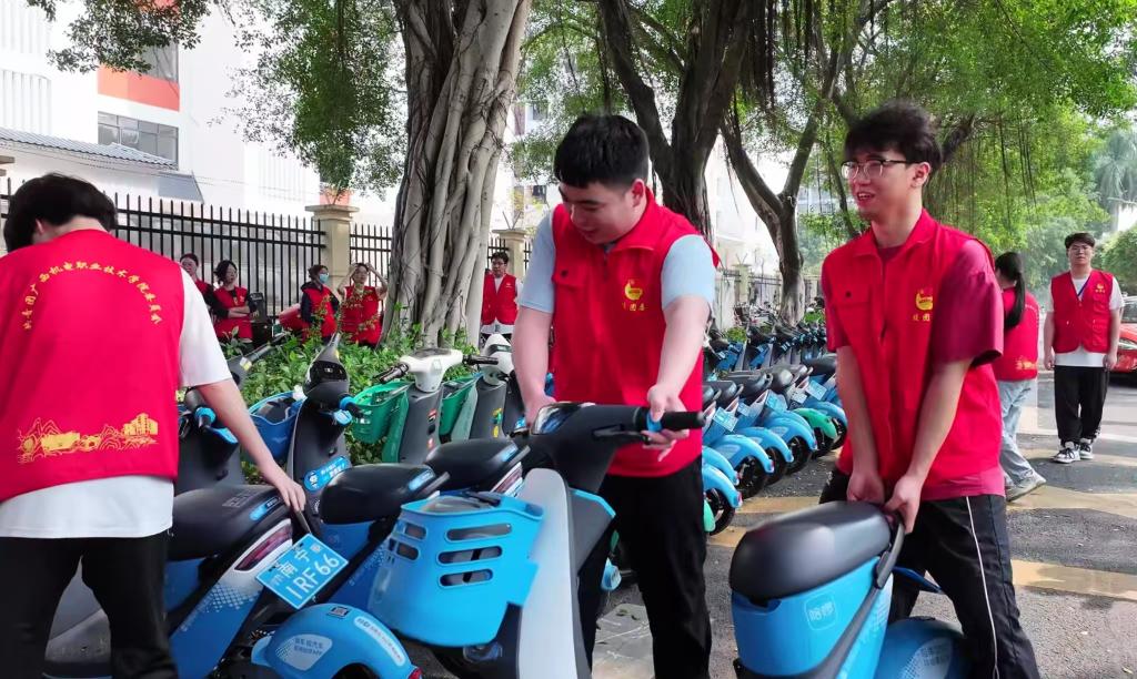 志愿者们在万象城官网西门将共享单车排列整齐