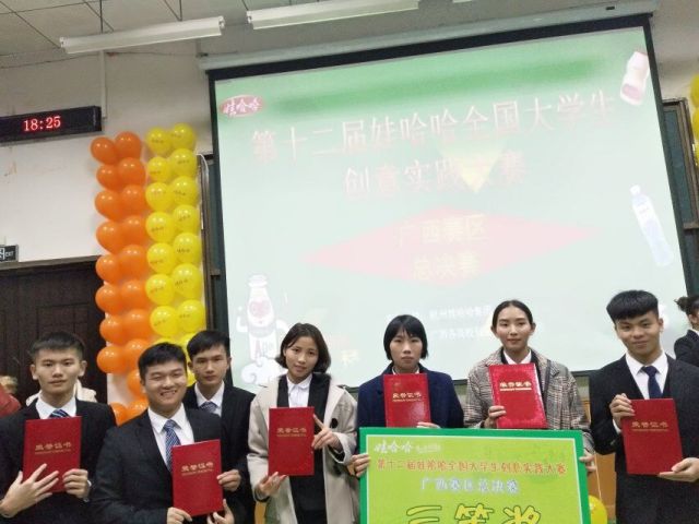 为了贯彻落实《国务院关于进一步做好新形势下就业创业工作的意见》和教育部《关于大力推进高等学校创新创业教育和大学生自主创业工作的意见》文件要求,培养大学生创业意识、合作意识和责任意识,提高大学生自主学习能力和创新创业能力。我院商贸与管理协会积极组织队伍参加了由杭州娃哈哈集团主办“创意改变世界”—“当梦想照进现实”第12届娃哈哈全国大学生创意实践大赛。其中由人文科学系人力1701班的队长何周文,带领的“王牌队”荣获一等奖。由工商管理系物流1801扈新国带队的“邕江948队”,和电气工程系仪表1701班钟大雄带领的“大雄队”两个团队分别获得三等奖!本次的广西第十二届娃哈哈营销大赛由杭州娃哈哈集团主办、我院商贸与管理协会承办,经过协会成员的线上宣传,线下校内推广,发放报名活动单等宣传,院内的同学们纷纷主动招募队员,组成一个个队伍积极报名参赛,协会自行组织的动员大会也按预期计划开启,经过三个月的努力拼搏本次大赛圆满落幕。