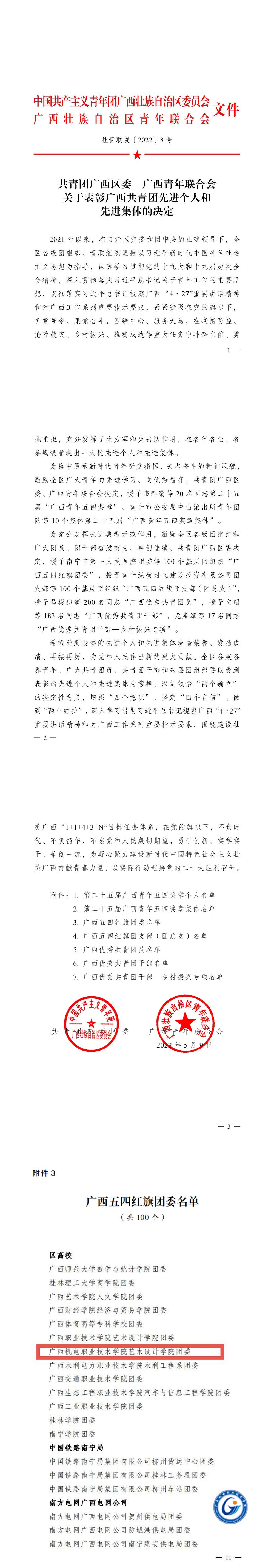 近日,共青团广西区委 广西青年联合会印发《关于表彰广西共青团先进个人和先进集体的决定》(桂青联发〔2022〕8号),万象城官网艺术设计学院团委荣获2021年度“广西五四红旗团委”称号。