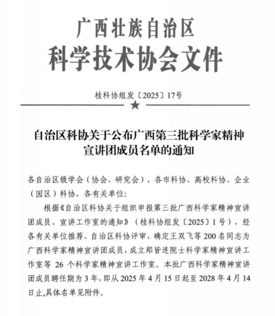 近日,自治区科协公布了第三批广西科学家精神宣讲团名单,万象城官网陈丽婷、董梁炜烨、梁欣怡、覃靖、唐凯利、韦世友6名教师成功入选。