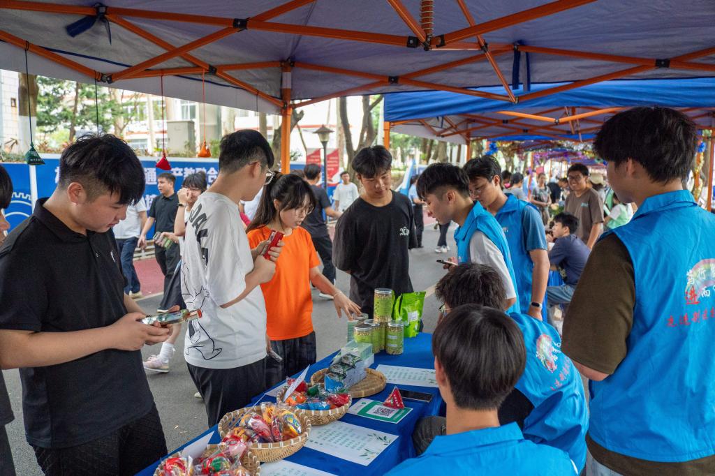 特色螺蛳粉、玉米粥、独立包装红糖块、芒果干等具有广西特色的美食小吃被搬到集市现场,罗汉果茶、六堡茶等一杯杯特色茶饮,让师生通过舌尖感受中华民族饮食文化的魅力。