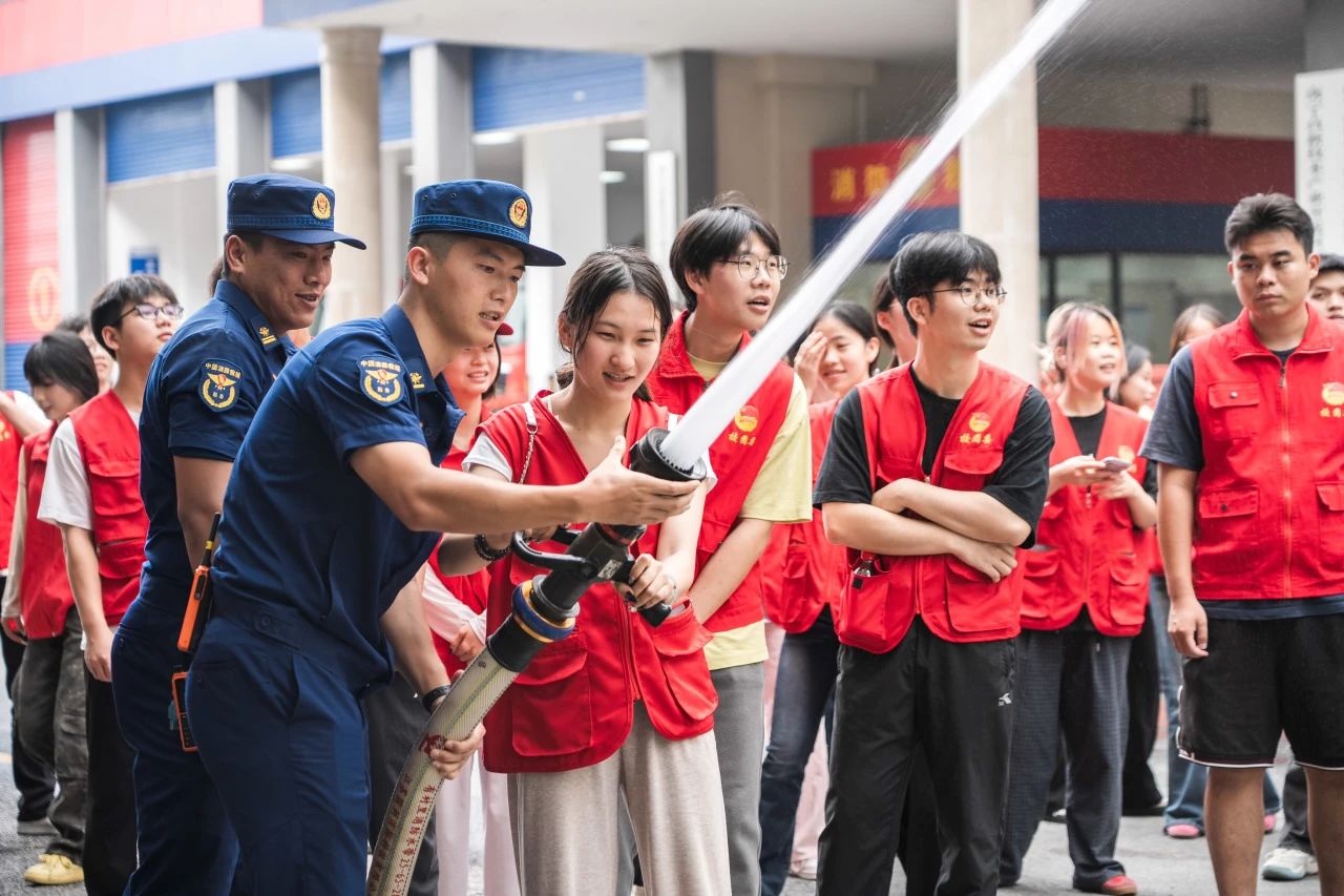 场地另一侧,消防水枪准备就绪。在消防员协助指导下,同学们体验了水枪的威力,轮流操作感受水流冲击力,学习水枪使用的模式切换及实际灭火操作,让同学们深入了解不同模式的消防水枪在实际灭火中的应用。
