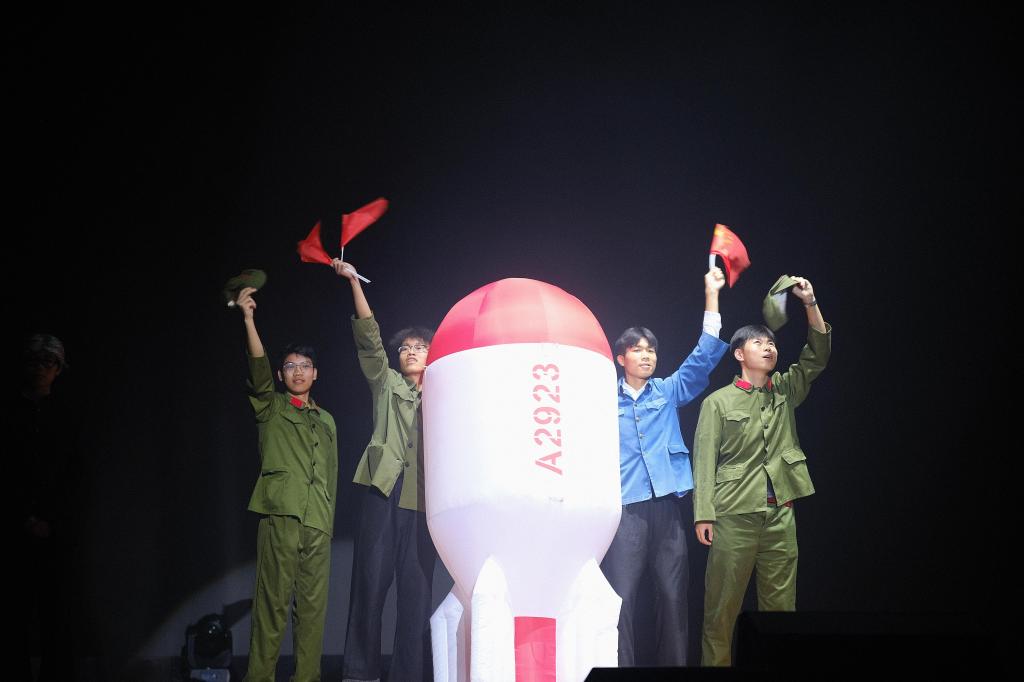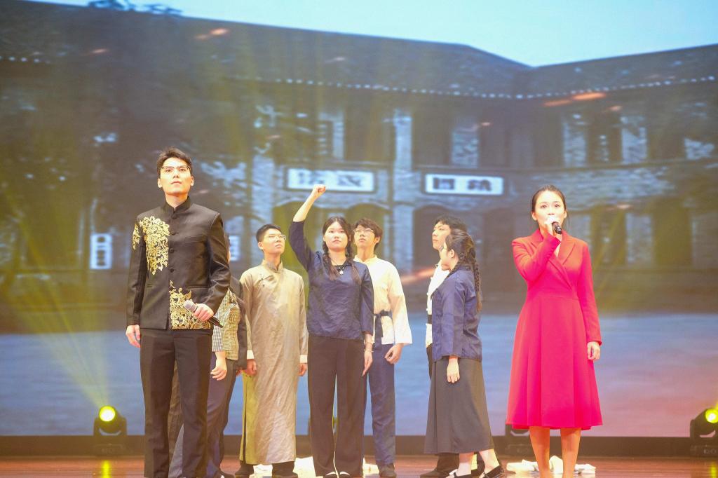 本次主题团日活动紧扣主题,精心策划了三个篇章,共包含14个精彩纷呈的节目。在第一篇章“薪火相传・初心如磐”,情景诗朗诵《工火燎原》回溯中国工人阶级在五四运动中作为独立政治力量登上历史舞台的壮阔场景,以汽笛声与诗韵交织重现工运火种燎原的革命情怀;南宁中心血站带来的情景舞蹈《生命之花》以生动舞姿表达对生命的敬畏礼赞;讲述剧《等待》,以邓稼先隐姓埋名28年投身核事业为背景,演绎科学家夫妇“二十八年分离,一生守望”的家国大爱,令现场观众动容。第二篇章“砺刃铸魂・青春践梦”聚焦时代使命与青年作为。舞蹈《我心中的红》巧妙融合光影与肢体语言,深情诠释革命历史的传承;小品《擦亮眼睛》则以幽默诙谐的剧情,犀利揭露网络诈骗手段,寓教于乐,反诈教育意义深远。情景合唱《稻・鱼》依托侗族稻作文化,以“稻浪翻涌、鱼跃欢歌”的生动意象,细腻描绘出各族同胞在中国共产党的光辉照耀下,携手并进、团结奋进的壮美图景。第三篇章“智创未来・向新而行”精彩纷呈:壮族铜鼓韵律演绎古朴与现代交融之美,机械臂与艺术巧妙结合,展现科技魅力;歌曲《篇章》激昂唱响,串联起学子们在科技攻关、社会服务一线的奋斗瞬间,全场响起“请党放心,强国有我”的青春誓言,共鸣强烈。