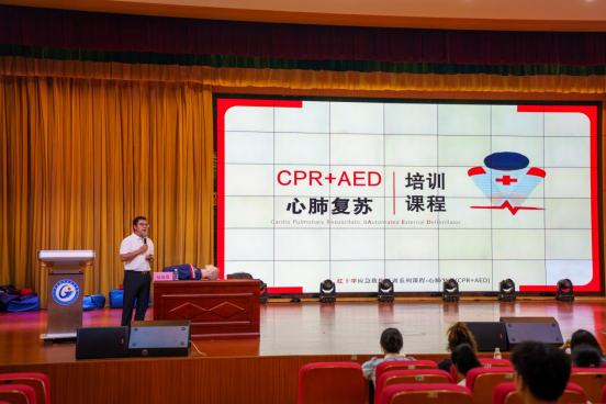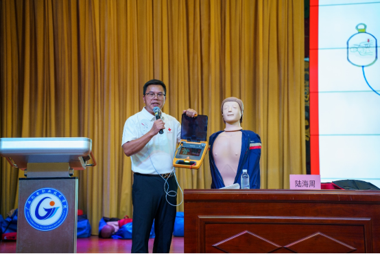 此次培训采用理论教学与实操考核相结合的标准化流程,围绕心肺复苏、自动体外除颤器操作等核心内容展开。陆海周对红十字运动标志、红十字运动起源进行了详细介绍,指出红十字运动以“人道、博爱、奉献”为宗旨,在全球范围内致力于保护人的生命和健康,而掌握应急救护技能正是践行这一宗旨的重要体现。并结合实际案例,向同学们强调了“黄金四分钟”急救时间窗的重要性。在理论教学中,他系统讲解了急救现场评估、患者意识判断、急救呼叫流程、心肺复苏以及AED设备使用要点等规范操作。
