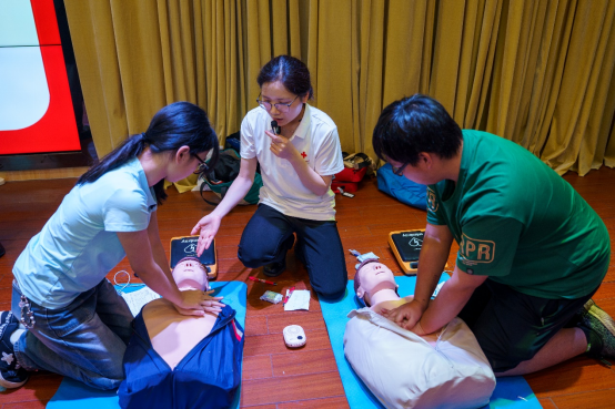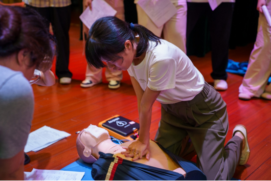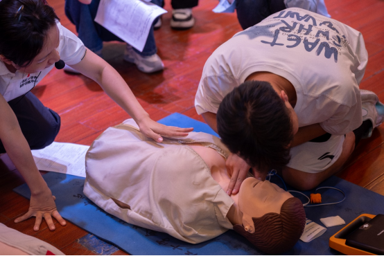 实操环节,培训团队采用“一对一”指导模式,利用专业心肺复苏模拟人及AED训练机,对胸外按压深度、频率、AED电极片定位等关键技术进行标准化训练。