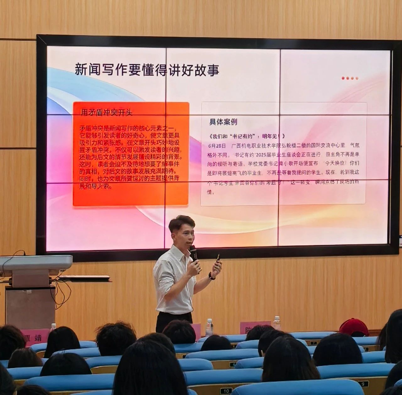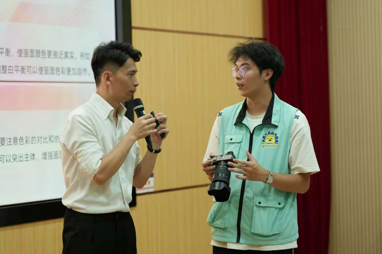 在培训中,陈峻辉老师围绕新闻写作和摄影摄像两方面展开讲解。在新闻写作部分,他强调了新闻的六要素,即时间、地点、人物、事件、起因和结果,指出这是新闻报道中不可或缺的内容。同时,还介绍了新闻价值的判断标准,帮助学生判断哪些内容值得报道。此外,他还结合自己在广西广播电视台的工作经历,分享了如何让文章更加出彩的实践经验,为学员们提供了宝贵的参考。