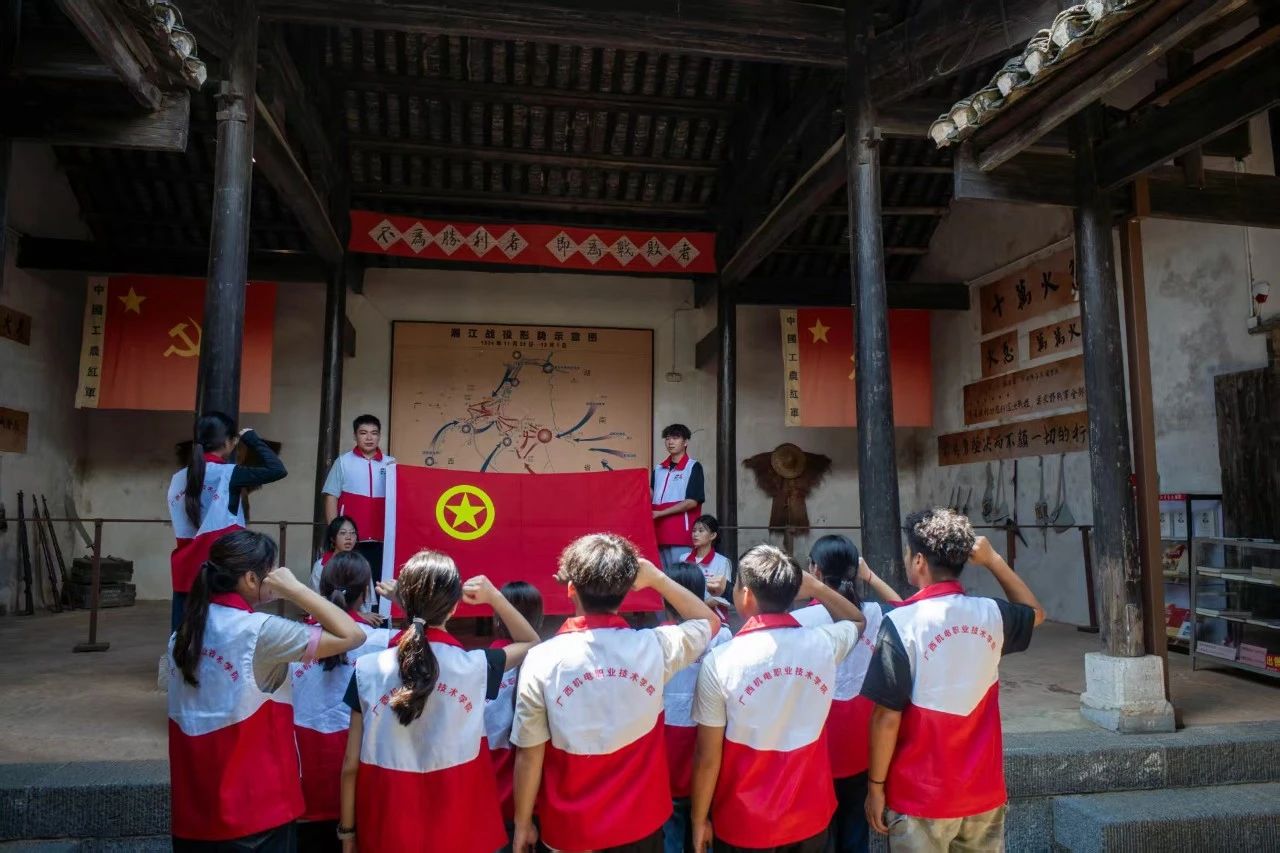 在兴安界首渡口红军堂,实践团开启了一场深刻的红色文化学习之旅。讲解员详细地描绘了1934年湘江战役的壮烈场面,实践团成员站在渡口遗迹前,仿佛能目睹当年红军战士们在国民党军的重重包围下,不畏艰险,奋勇渡过湘江的英勇形象。队员们怀着崇敬之心,肃立在红军堂前,庄重地重温入团誓词。铮铮誓言,在渡口上空久久回荡,这既是对红色基因的虔诚传承,也是对“强国有我”使命担当的坚定誓言,激荡着每一位青年的心田。
