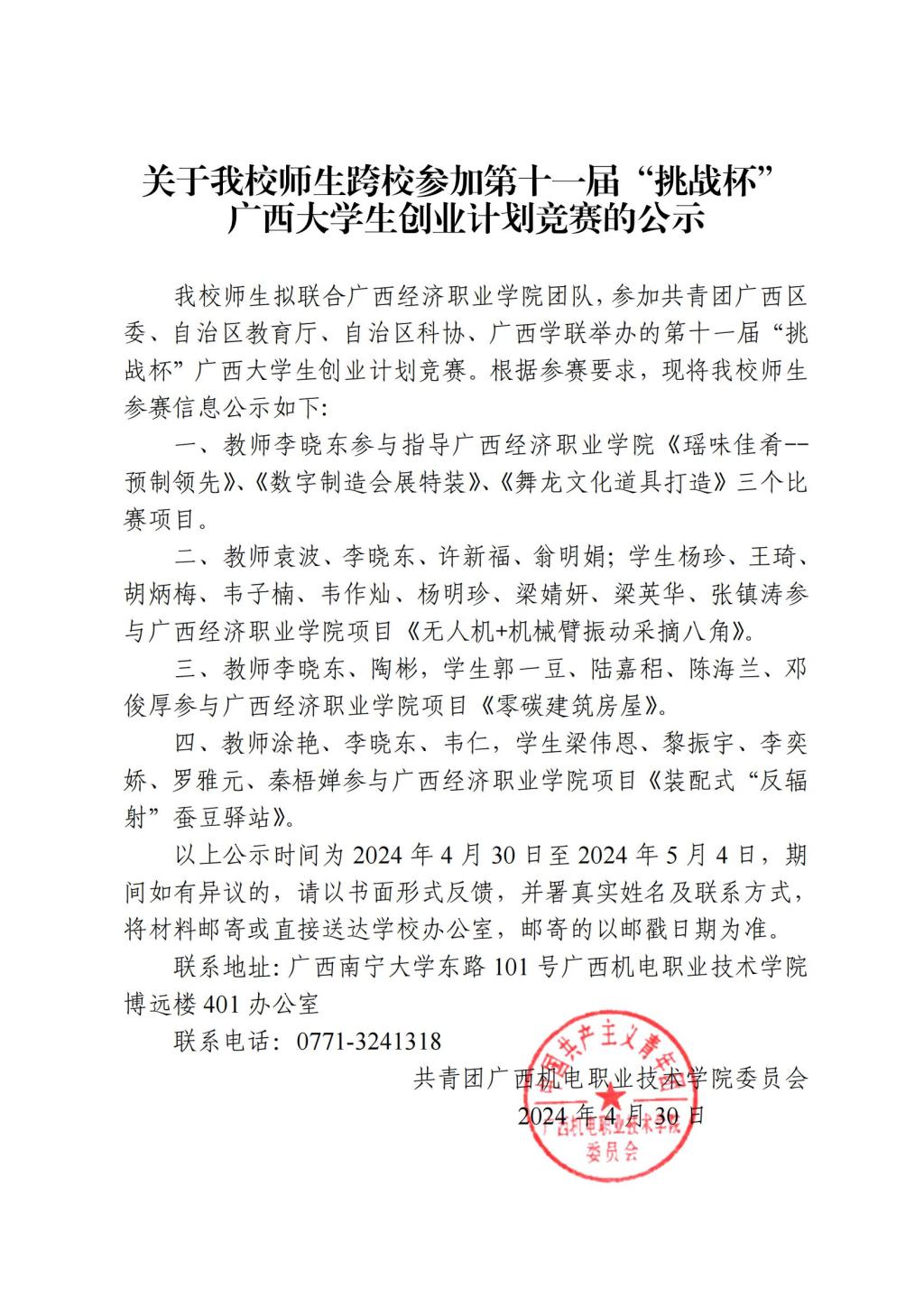 公示时间为2024年4月30日至2024年5月4日。如对项目有异议,请以电话形式联系校团委反馈,联系电话:0771-3241318。