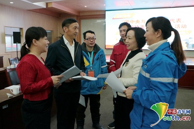 全国人大代表和全国政协委员们与快递小哥代表面对面交流。中国青年网记者 李川 摄