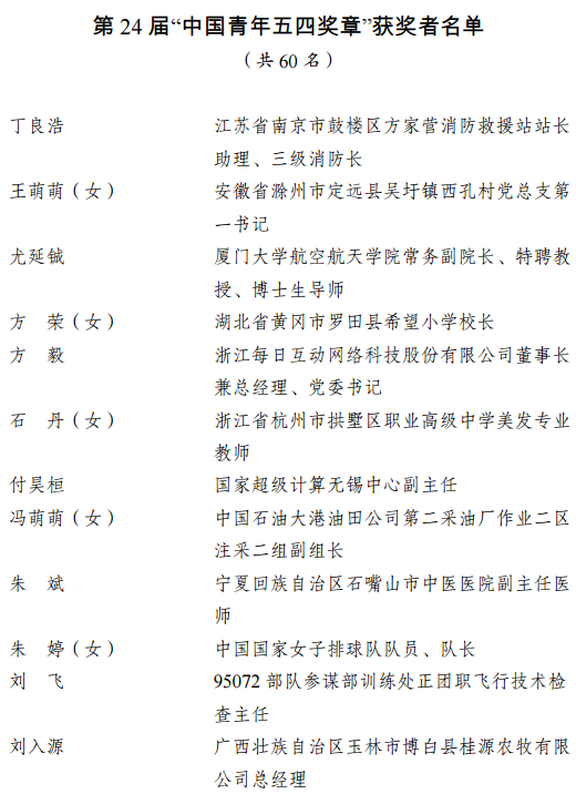 1. 第24届“中国青年五四奖章”获奖者名单