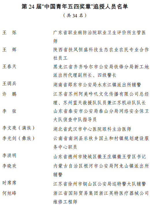 3. 第24届“中国青年五四奖章”追授人员名单