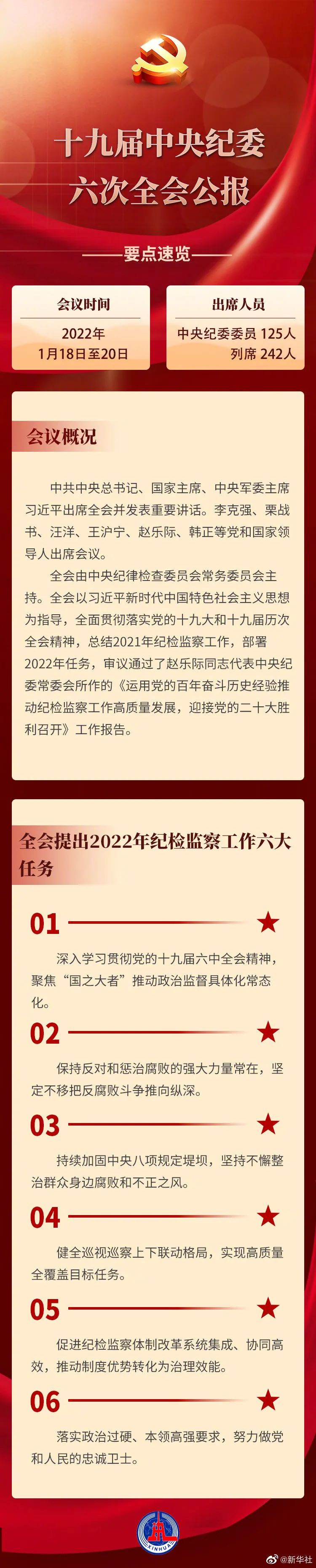 中国共产党第十九届中央纪律检查委员会第六次全体会议,于2022年1月18日至20日在北京举行。出席这次全会的有中央纪委委员125人,列席242人。中共中央总书记、国家主席、中央军委主席习近平出席全会并发表重要讲话。李克强、栗战书、汪洋、王沪宁、赵乐际、韩正等党和国家领导人出席会议。全会由中央纪律检查委员会常务委员会主持。全会以习近平新时代中国特色社会主义思想为指导,全面贯彻落实党的十九大和十九届历次全会精神,总结2021年纪检监察工作,部署2022年任务,审议通过了赵乐际同志代表中央纪委常委会所作的《运用党的百年奋斗历史经验推动纪检监察工作高质量发展,迎接党的二十大胜利召开》工作报告。全会认真学习、深刻领会习近平总书记重要讲话。一致认为,讲话深刻总结新时代党的自我革命的成功实践,深刻阐述全面从严治党取得的历史性、开创性成就,产生的全方位、深层次影响,对坚持不懈把全面从严治党向纵深推进、迎接党的二十大胜利召开作出战略部署。讲话立意高远、思想深邃、内涵丰富,充分体现了以习近平同志为核心的党中央信念坚定、无私无畏的境界情怀,正视问题、刀刃向内的政治勇气,不忘初心、勇毅前行的使命担当,具有很强的政治性、指导性、针对性,是推进新时代党的建设新的伟大工程的基本遵循,是纪检监察工作高质量发展的行动指南。习近平总书记对纪检监察干部队伍寄予殷切期望,提出明确要求。要深入学习贯彻习近平总书记关于党的自我革命的战略思想,不断提高政治判断力、政治领悟力、政治执行力,继续打好党风廉政建设和反腐败斗争攻坚战、持久战,为保持平稳健康的经济环境、国泰民安的社会环境、风清气正的政治环境作出应有贡献。全会指出,2021年是党和国家历史上具有里程碑意义的一年。以习近平同志为核心的党中央团结带领全党全国各族人民,隆重庆祝中国共产党成立一百周年,胜利召开党的十九届六中全会、制定党的第三个历史决议、全面总结党的百年奋斗重大成就和历史经验,开展党史学习教育,如期打赢脱贫攻坚战,如期全面建成小康社会、实现第一个百年奋斗目标,开启全面建设社会主义现代化国家、向第二个百年奋斗目标进军新征程,党和国家各项事业取得新的重大成就,“十四五”实现良好开局。在党中央坚强领导下,中央纪委国家监委和各级纪检监察机关深入学习领悟习近平新时代中国特色社会主义思想,深刻认识“两个确立”的决定性意义,自觉担负“两个维护”重大政治责任,深刻把握纪检监察工作在推进党的自我革命中的职责任务,稳中求进、坚定稳妥,实事求是、守正创新,保持全面从严治党永远在路上的清醒坚定,保持正风肃纪、反腐惩恶的战略定力,围绕现代化建设大局发挥监督保障执行、促进完善发展作用,纪检监察工作高质量发展取得新成效。深入学习党的十九届六中全会精神和习近平总书记关于党的历史的重要论述、在庆祝中国共产党成立100周年大会上的重要讲话,增强历史自信,练就斗争本领,坚定全面从严治党的政治自觉。紧紧围绕“十四五”开好局加强政治监督,强化对“一把手”和领导班子的日常监督,纠正贯彻落实党中央方针政策和工作部署存在的政治偏差。坚决查处重大腐败案件,严肃查处政治问题和经济问题交织的腐败案件,加大国企、金融、政法、粮食购销、开发区建设等领域反腐败力度,做实以案促改、以案促治。一刻不停歇推动落实中央八项规定精神,深化纠治形式主义、官僚主义、享乐主义和奢靡之风,加强对换届纪律风气的监督。持续深化政治巡视,发挥巡视巡察综合监督作用。坚持依规依纪依法,深化运用“四种形态”,精准规范实施问责。围绕巩固拓展脱贫攻坚成果同乡村振兴有效衔接开展过渡期专项监督,深化民生领域腐败和作风问题专项治理,扎实推进“我为群众办实事”实践活动,坚决惩治涉黑涉恶腐败和“保护伞”。深化纪检监察体制改革,加强法规制度建设,严格监督约束执纪执法权,坚决防止“灯下黑”。全会总结了过去一年实践中形成的认识体会,在肯定成绩的同时,实事求是分析了纪检监察工作和干部队伍建设存在的问题,要求高度重视、切实加以解决。全会提出,2022年将召开党的二十大,这是党和国家政治生活中的一件大事。做好纪检监察工作,要以习近平新时代中国特色社会主义思想为指导,全面贯彻落实党的十九大和十九届历次全会精神,增强“四个意识”、坚定“四个自信”、做到“两个维护”,坚持稳中求进工作总基调,立足新发展阶段,完整、准确、全面贯彻新发展理念,构建新发展格局,推动高质量发展,自觉把握和运用党的百年奋斗历史经验,弘扬伟大建党精神,永葆自我革命精神,坚持全面从严治党战略方针,坚定不移将党风廉政建设和反腐败斗争进行到底,持续深化不敢腐、不能腐、不想腐一体推进,惩治震慑、制度约束、提高觉悟一体发力,努力取得更多制度性成果和更大治理成效,加强纪检监察机关规范化、法治化、正规化建设,更好发挥监督保障执行、促进完善发展作用,迎接党的二十大胜利召开。全会强调,勇于自我革命是我们党区别于其他政党的显著标志,是党跳出治乱兴衰历史周期率、历经百年沧桑更加充满活力的成功秘诀。各级纪检监察机关要坚持用马克思主义中国