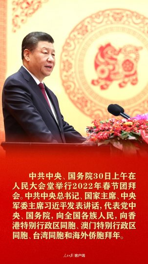 中共中央、国务院30日上午在人民大会堂举行2022年春节团拜会。中共中央总书记、国家主席、中央军委主席习近平发表讲话,代表党中央、国务院,向全国各族人民,向香港特别行政区同胞、澳门特别行政区同胞、台湾同胞和海外侨胞拜年。