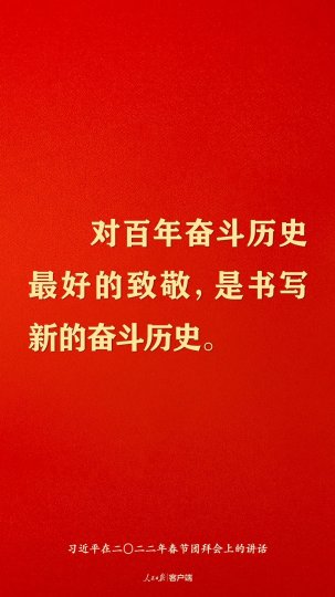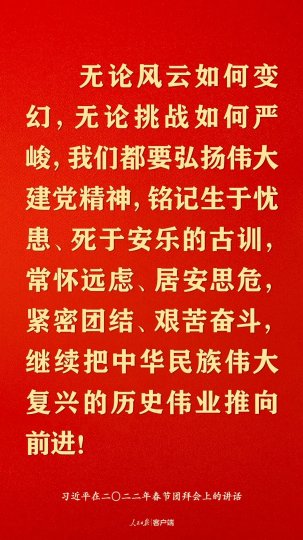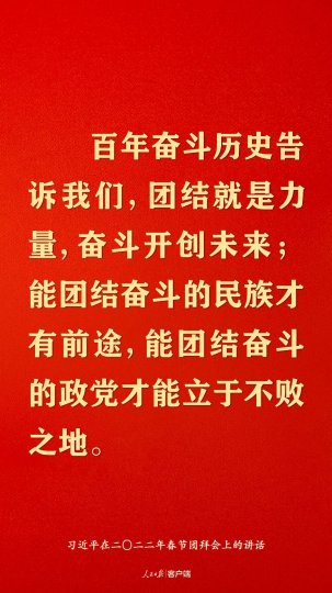 我们隆重庆祝中国共产党成立一百周年,礼序乾坤、乐和天地,击鼓催征、奋楫扬帆,激发了全党全社会奋进新时代的磅礴力量。我们召开党的十九届六中全会并作出第三个历史决议,如期打赢脱贫攻坚战,如期全面建成小康社会,实现第一个百年奋斗目标,开启全面建设社会主义现代化国家新征程,在中华民族伟大复兴历史进程中写下了浓墨重彩的一笔。一年来,我国经济发展和疫情防控保持世界领先,构建新发展格局迈出新步伐,高质量发展取得新成效,国家战略科技力量加快壮大,改革开放迈出新步伐,民生保障有力有效,生态文明建设持续推进,碳达峰碳中和工作全面部署,国防和军队建设有力拓展,香港实现由乱转治,反“独”促统斗争不断加强,中国特色大国外交继续推进,党史学习教育成效显著,社会大局保持稳定,“十四五”实现良好开局。在百年变局和世纪疫情交织的复杂形势下,我们取得这些成绩,极大增强了全党全国各族人民奋进新征程、建功新时代的豪情和信心。过去一百年,中国共产党向人民、向历史交出了一份优异的答卷。现在,党团结带领全国各族人民踏上了实现第二个百年奋斗目标新的赶考之路。一百年来,党和人民取得的一切成就都是团结奋斗的结果,团结奋斗是中国共产党和中国人民最显著的精神标识。百年奋斗历史告诉我们,团结就是力量,奋斗开创未来;能团结奋斗的民族才有前途,能团结奋斗的政党才能立于不败之地。百年奋斗历史还告诉我们,围绕明确奋斗目标形成的团结才是最牢固的团结,依靠紧密团结进行的奋斗才是最有力的奋斗。我们靠团结奋斗创造了辉煌历史,还要靠团结奋斗开辟美好未来。只要14亿多中国人民始终手拉着手一起向未来,只要9500多万中国共产党人始终与人民心连着心一起向未来,我们就一定能在新的赶考之路上继续创造令人刮目相看的奇迹!世界上最大的幸福莫过于为人民幸福而奋斗。心中装着百姓,手中握有真理,脚踏人间正道,我们信心十足、力量十足。无论风云如何变幻,无论挑战如何严峻,我们都要弘扬伟大建党精神,铭记生于忧患、死于安乐的古训,常怀远虑、居安思危,紧密团结、艰苦奋斗,继续把中华民族伟大复兴的历史伟业推向前进!对百年奋斗历史最好的致敬,是书写新的奋斗历史。今年下半年,中国共产党将召开第二十次全国代表大会,总结过去五年的工作,谋划未来一个时期的发展蓝图。我们要统筹国内国际两个大局,统筹推进“五位一体”总体布局、协调推进“四个全面”战略布局,统筹发展和安全,统筹疫情防控和经济社会发展,坚持稳中求进工作总基调,完整、准确、全面贯彻新发展理念,加快构建新发展格局,全面深化改革开放,推动高质量发展,持续保障和改善民生,着力保持平稳健康的经济环境、国泰民安的社会环境、风清气正的政治环境,以实际行动迎接党的二十大胜利召开。在中国传统文化中,虎是百兽之王,是力量、勇敢、无畏的象征。壬寅虎年,我们要以虎虎生威的雄风、生龙活虎的干劲、气吞万里如虎的精神,继续书写中国特色社会主义伟大事业的历史新篇章!北京冬奥会、冬残奥会即将开幕,中国人民已经做好准备,将为世界奉献一场简约、安全、精彩的奥运盛会,祝愿中外冰雪运动健儿如虎添翼、创造佳绩!最后,祝大家身体健康、阖家幸福、万事如意、虎年吉祥!