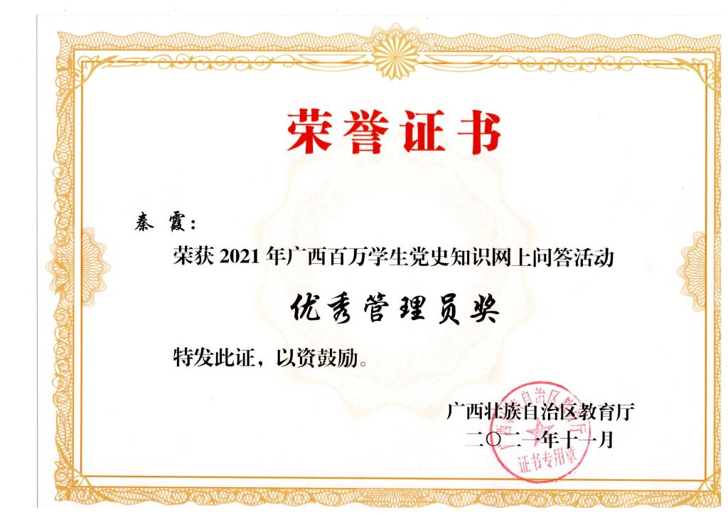 2021年11月,广西百万学生党史知识网上问答活动中,秦霞老师荣获省部级优秀管理员奖。颁奖单位:广西壮族自治区教育厅。