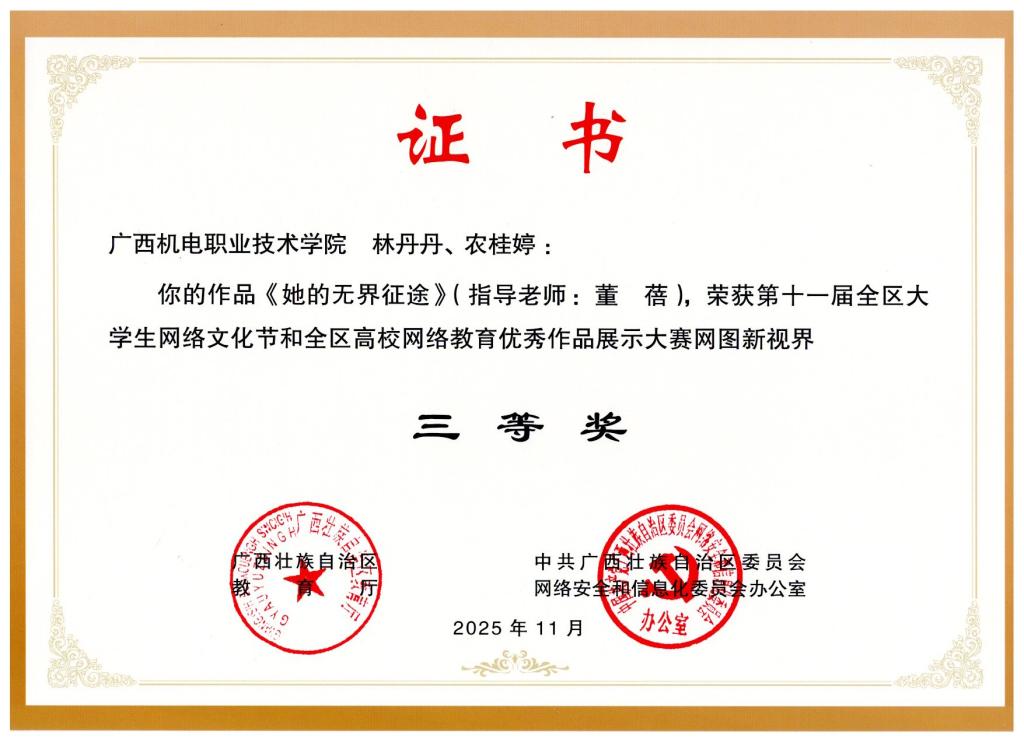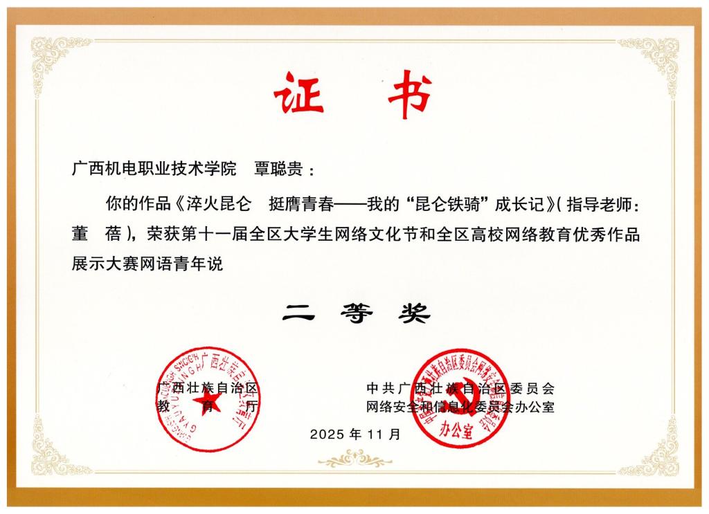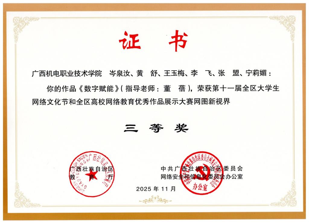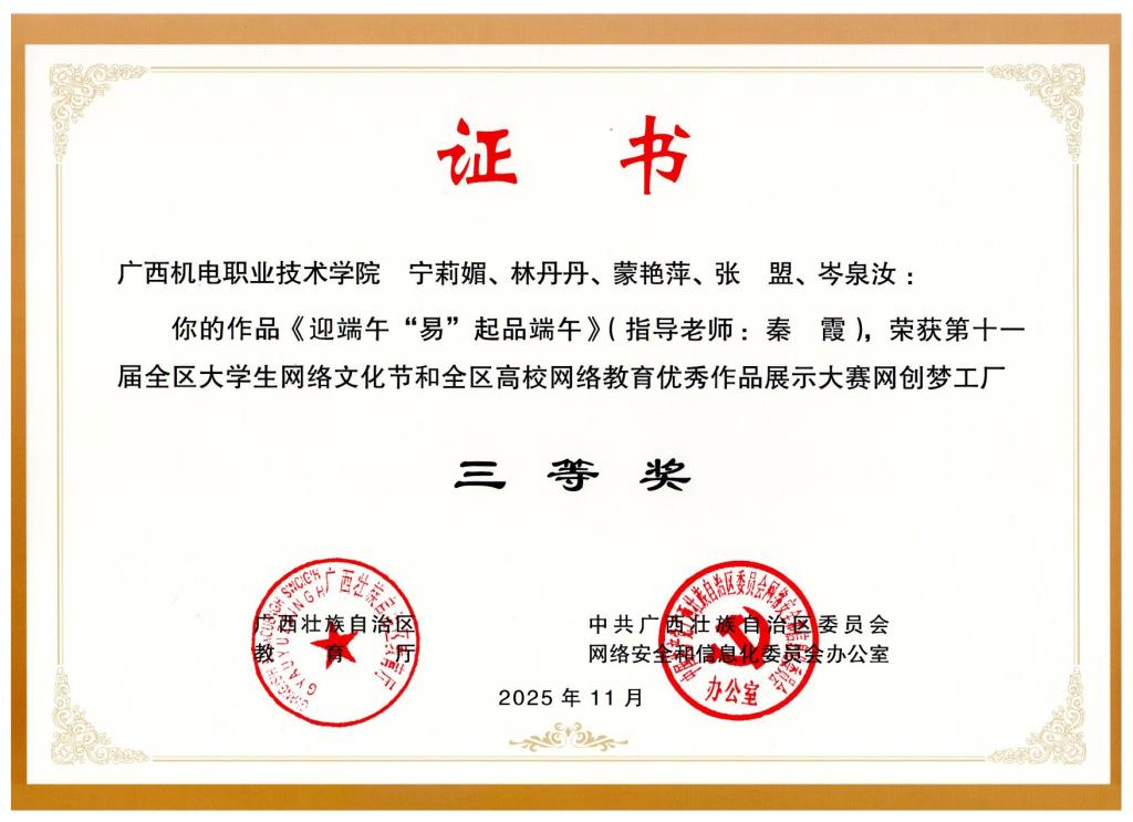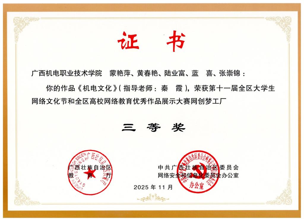 2025年12月,在第十一届全区大学生网络文化节中,荣获区赛二等奖1项、三等奖4项。颁奖单位:广西壮族自治区教育厅、中共广西壮族自治区委员会网络安全和信息化委员会办公室。