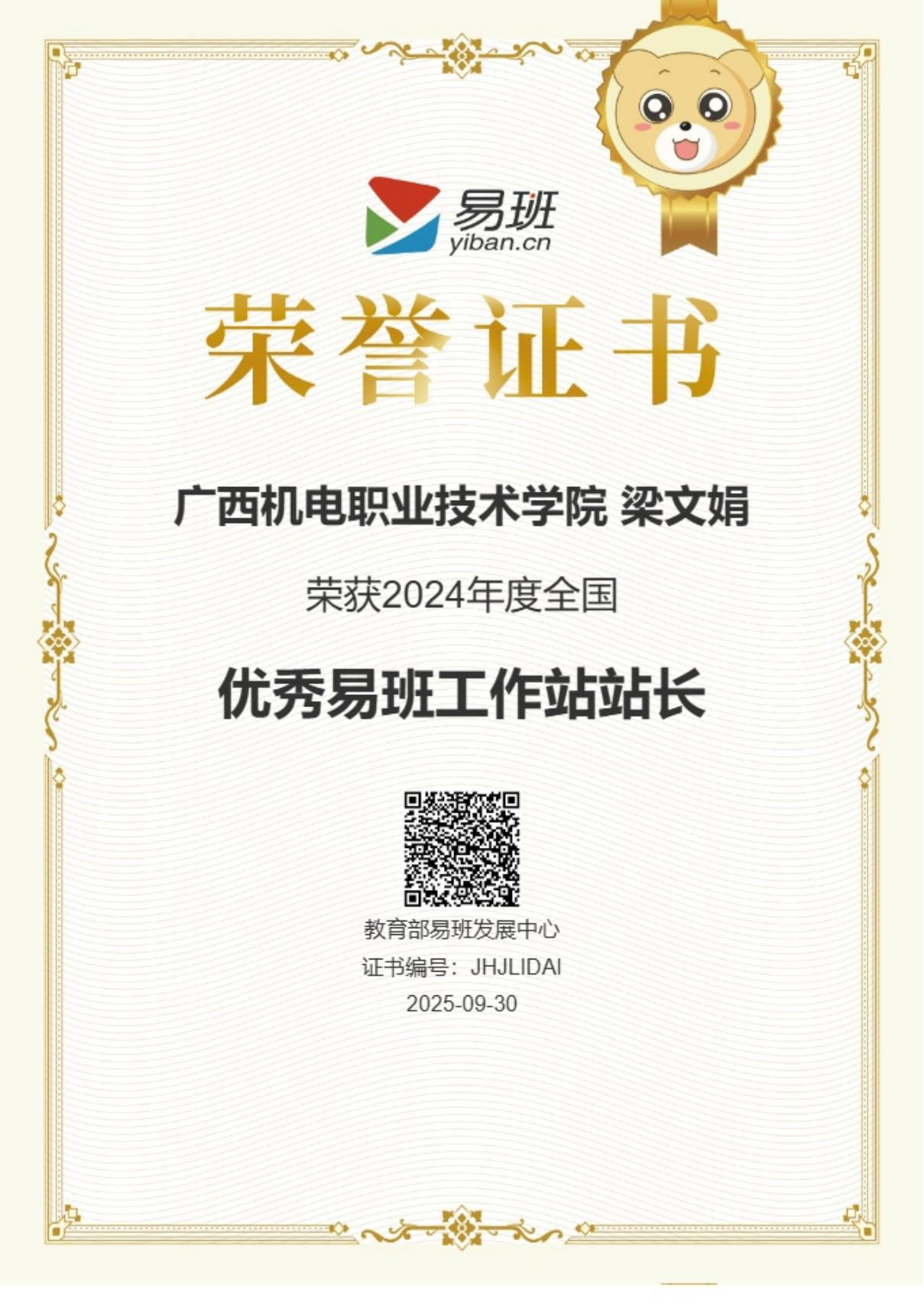 2024年12月,在2024年度全国易班共建优秀评选中,梁文娟同学荣获2024年度“全国优秀易班学生工作站站长”荣誉称号,颁奖单位:教育部易班发展中心。