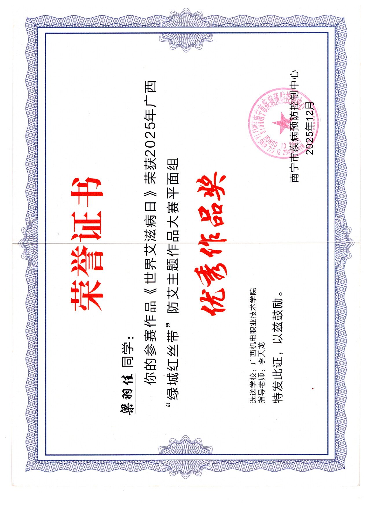 2025年12月,在广西“绿城红丝带”防艾主题大赛中,荣获视频组优秀作品奖2项、平面组优秀作品奖1项、知识竞赛挑战赛高校组三等奖1项。颁奖单位:南宁市疾病预防控制中心。