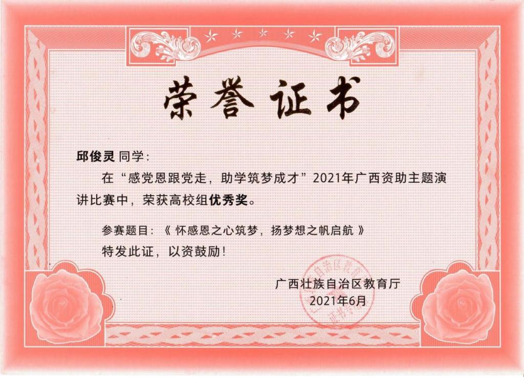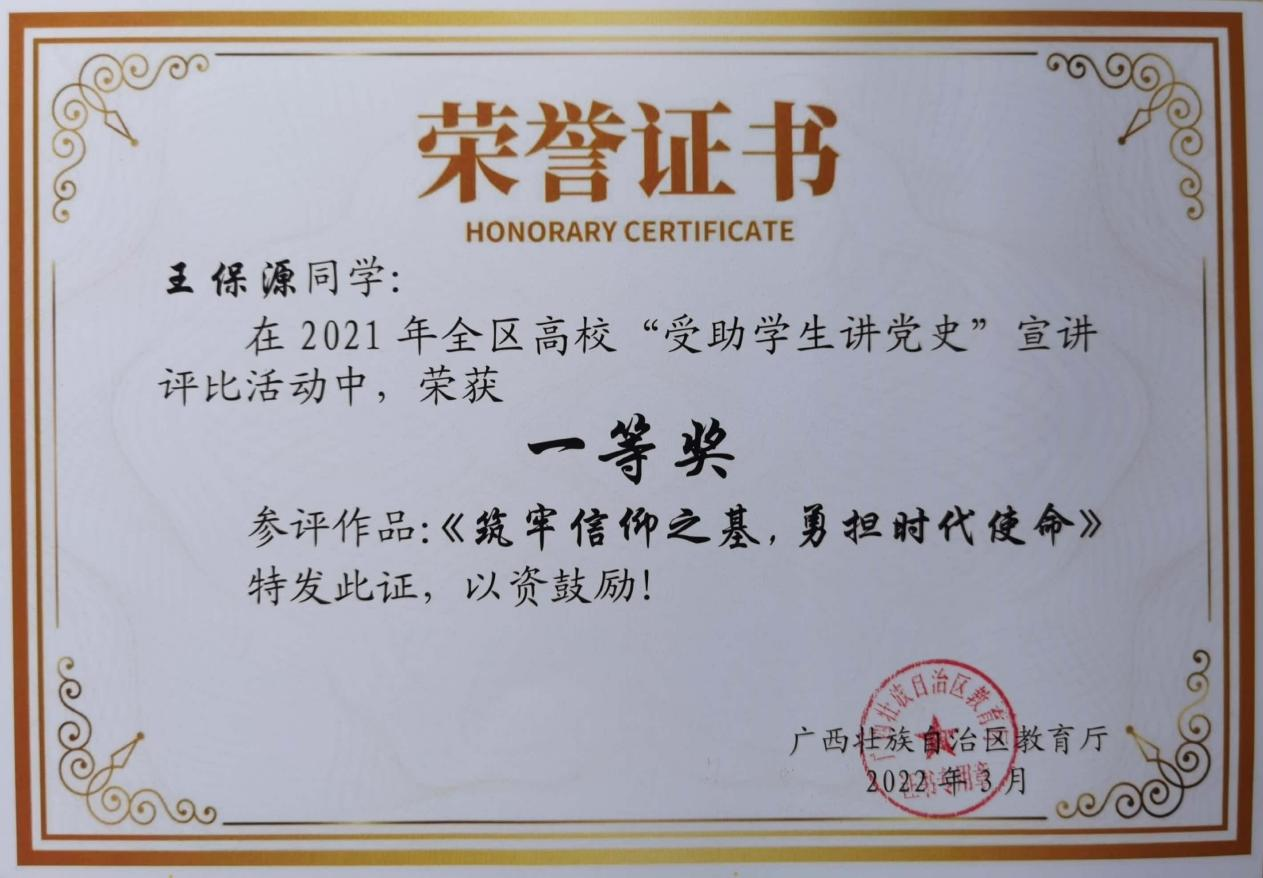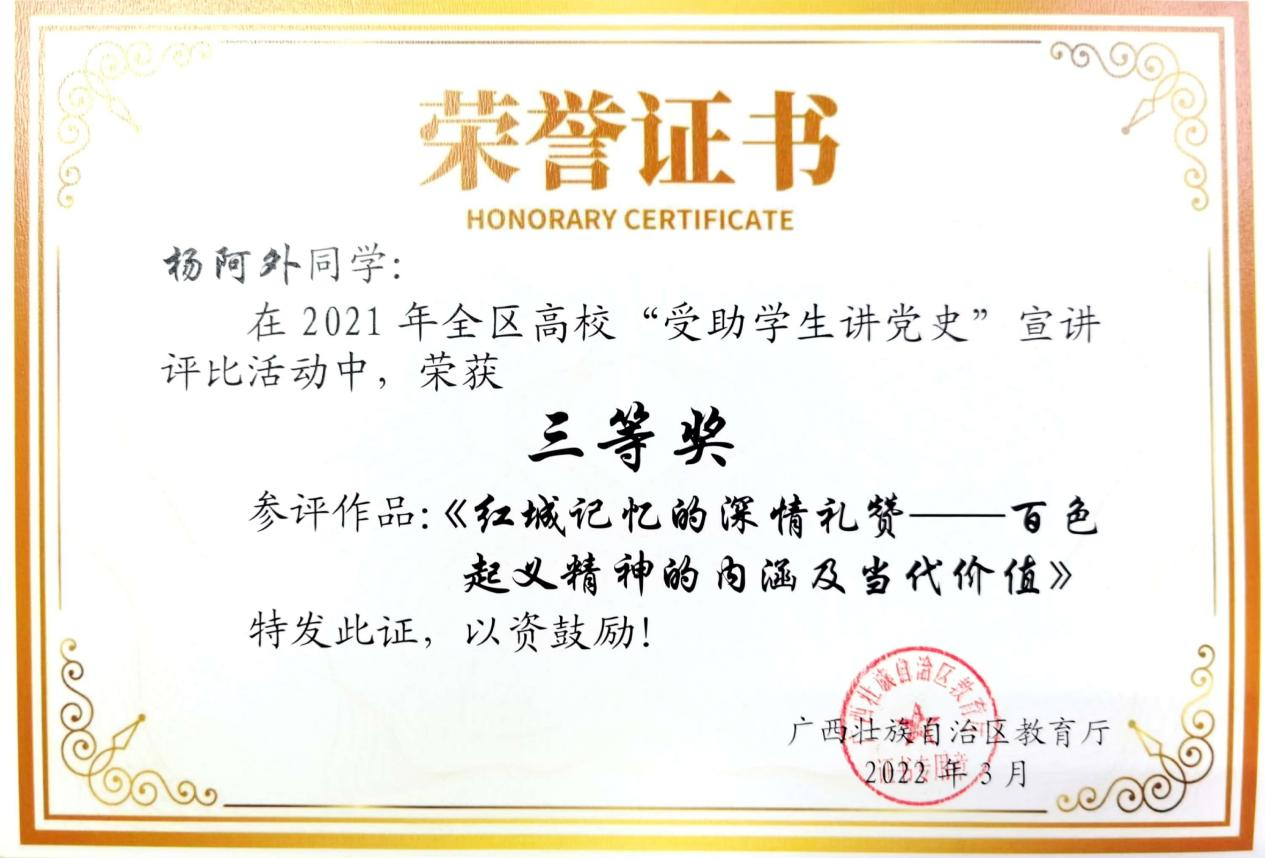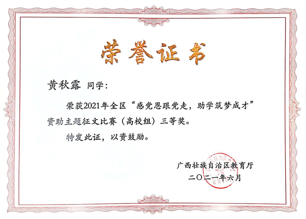 深化资助育人内涵,强化感恩励志教育,促进学生全面发展。以征文比赛、演讲比赛、受助学生讲党史等活动为载体,开展感恩教育、励志教育、诚信教育,引导学生铭记党和国家的关怀,增强社会责任感和使命感,将感恩之心转化为奋进之力。2021年,学生在资助类比赛中获自治区级一等奖一项,三等奖两项,优秀奖一项。