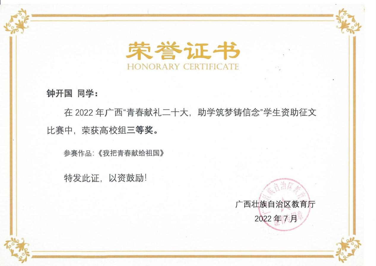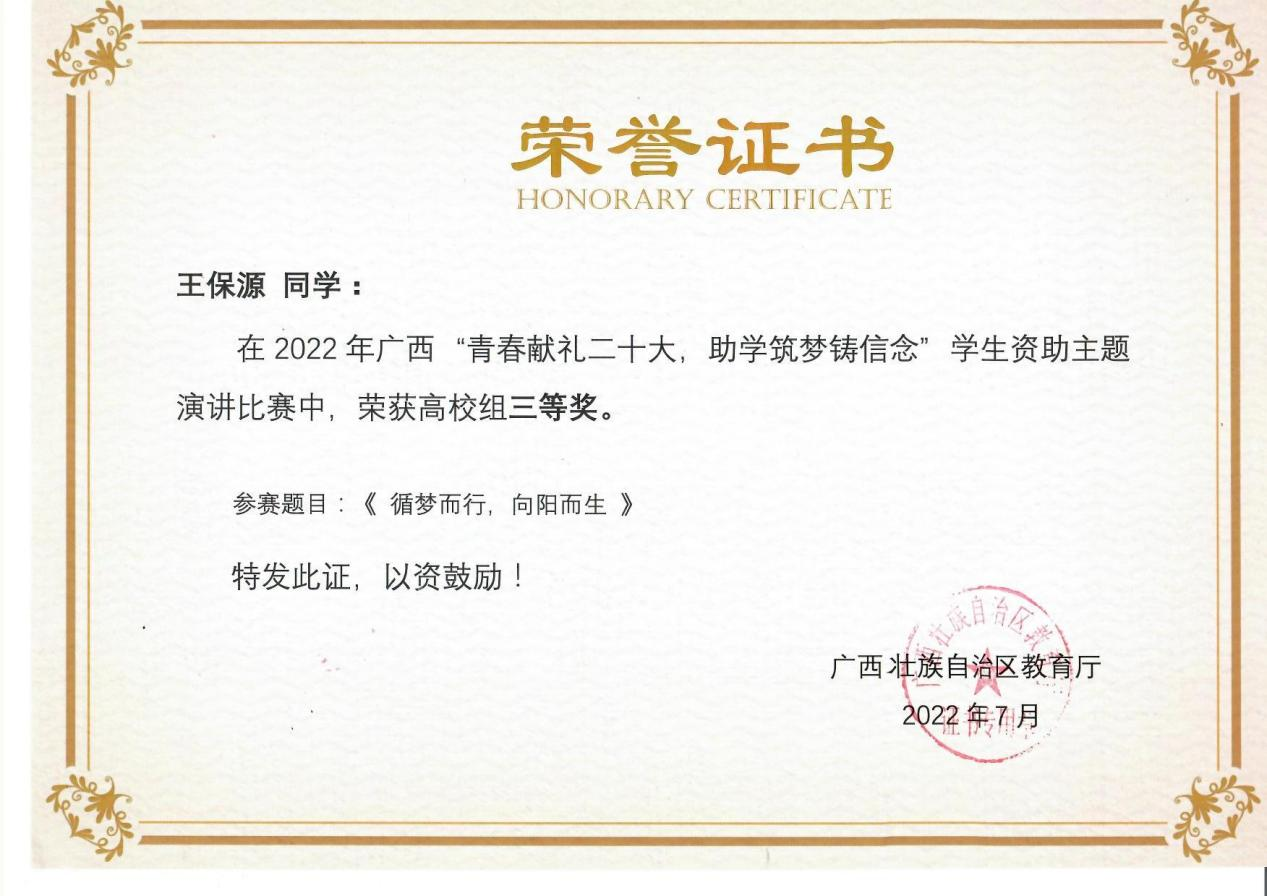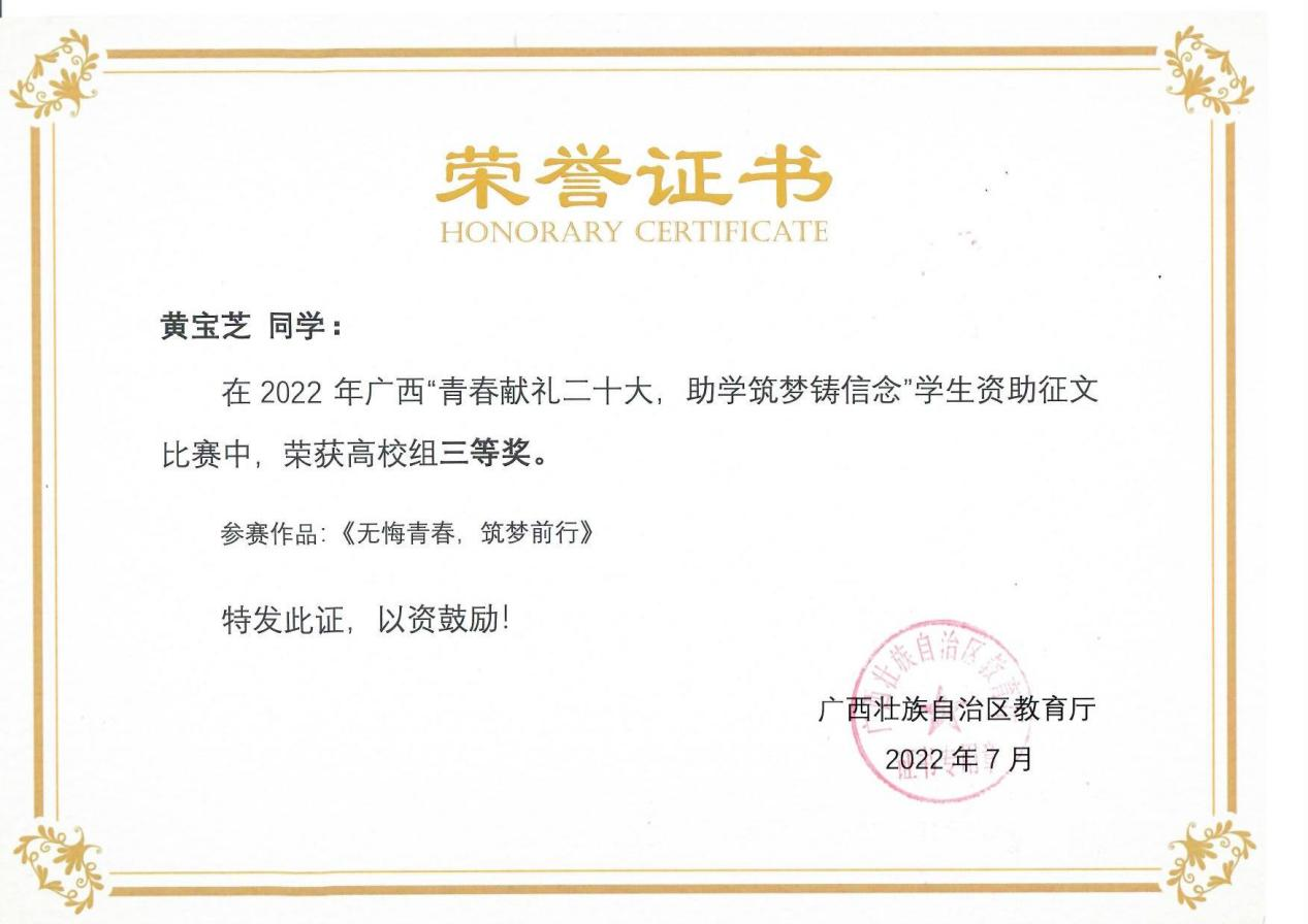 为深化资助育人内涵,引导受助学生常怀感恩之心、树立励志之志、恪守诚信之本,以资助政策落实为契机,精心组织以资助主题征文、演讲比赛等活动组成的资助政策宣传月。活动以“青春献礼二十大,助学筑梦铸信念”为主题,搭建起学生抒发心声、展现风貌的平台,取得了思想引领与实践育人的双重成效。2022年,学生在资助类比赛中获自治区级三等奖三项。