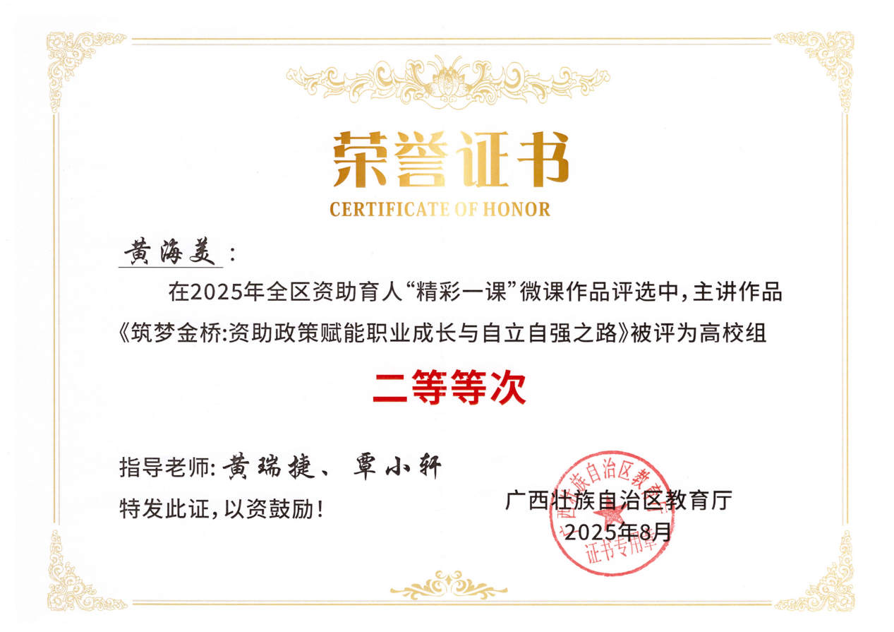 2025年围绕“资助为基、育人为本”核心目标,扎实推进各项资助工作,将经济帮扶与思想引领、能力培育深度融合,既为家庭经济困难学生筑牢求学保障线,也为其全面成长注入动力。思想引领,厚植感恩情怀。开展资助主题征文比赛、诚信教育讲座等活动,引导受助学生铭记关怀,树立诚信意识,懂得回馈社会;同时传递自立自强精神,鼓励学生正视困境,以积极心态面对学业与生活。选派资助政策宣讲团赴广西科技大学附属卫生学校和广西农牧工程学校开展资助政策宣传及国家奖学金获得者优秀事迹宣讲,为同学们树立了优秀的榜样,进一步加大了国家资助政策的宣传力度。