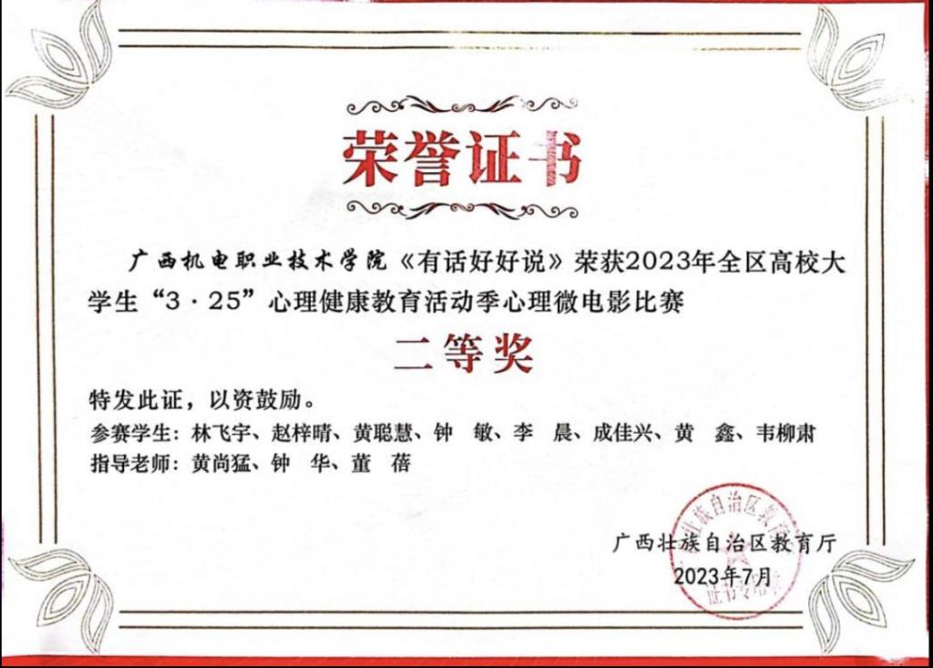 黄尚猛、钟华、董蓓制作的微电影《有话好好说》获得全区高校2023年“3.25”心理健康教育活动季心理微电影比赛二等奖