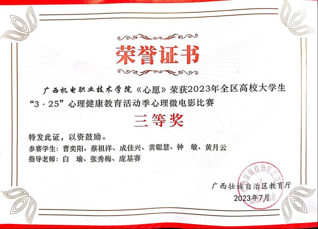 白瑜、张秀梅、庞基赛制作的微电影《心愿》获得全区高校2023年“3.25”心理健康教育活动季心理微电影比赛三等奖