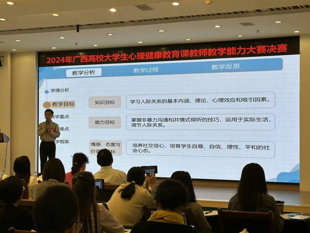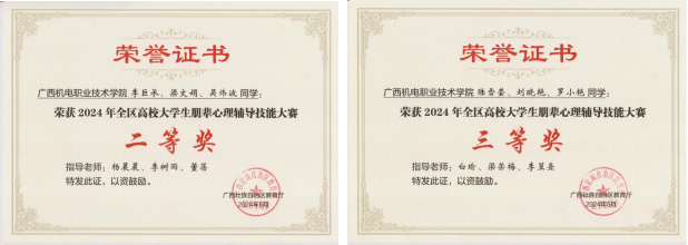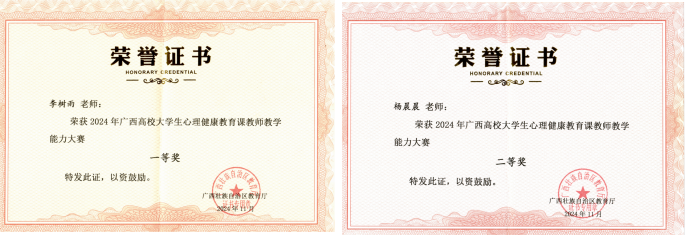 坚持以赛促教、以赛促改,持续提升心理健康教育课程质量,着力打造高素质心理教师队伍。万象城官网心理健康专职教师参加广西高校大学生心理健康教育课教师教学能力大赛,荣获一等奖、二等奖的好成绩。
