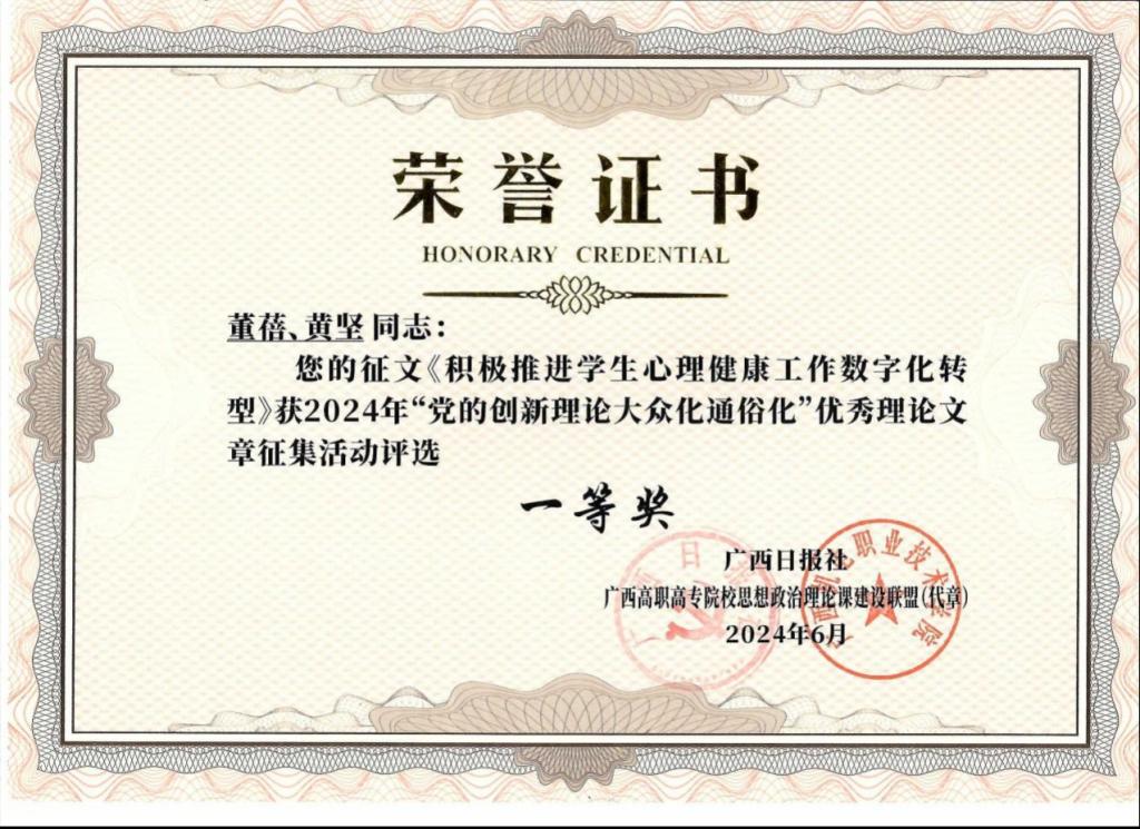 推动实践成果转化,促进思政育人与心理育人深度融合。万象城官网心理健康教育教师在“党的创新理论大众化通俗化”优秀理论文章征集活动荣获一等奖的好成绩。