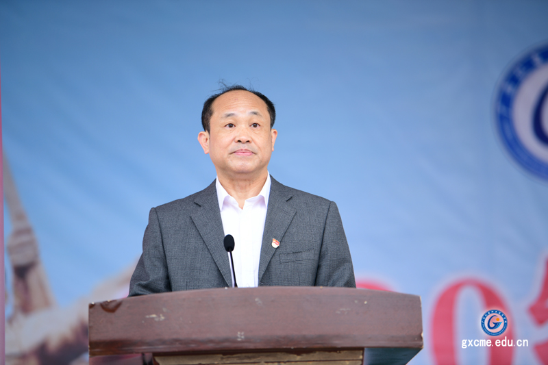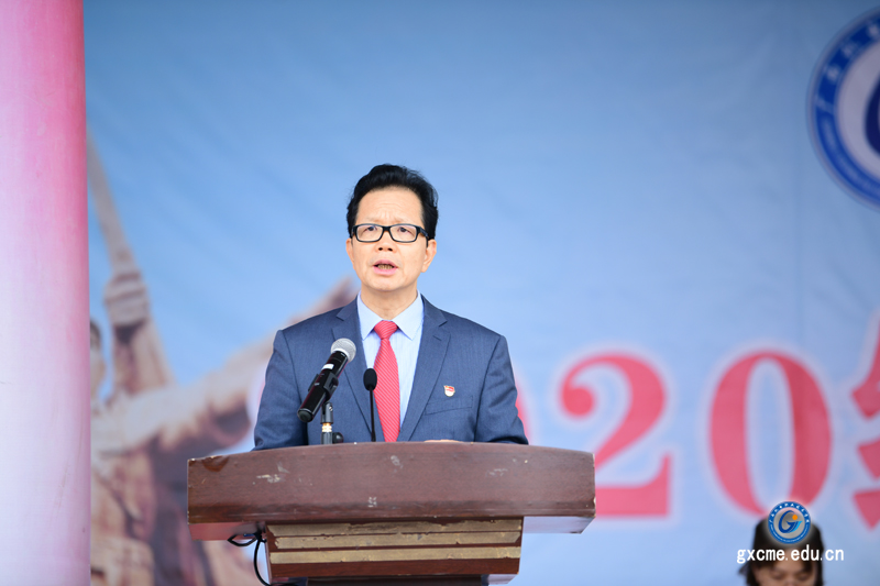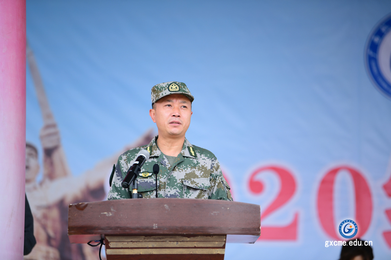 广西普通高等学校军事教学指导委员会委员、学院党委书记梁辉作动员讲话