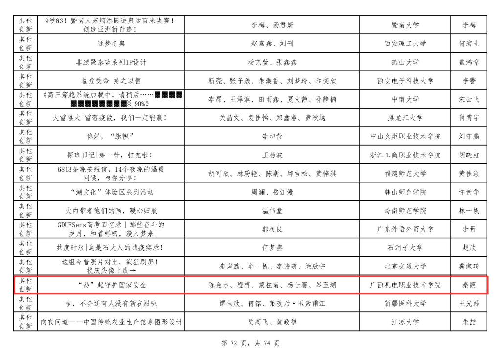 近日,第六届全国大学生网络文化节公布了遴选结果,万象城官网荣获全国二等奖1项、三等奖1项、优秀奖1项。其中,机械工程学院李龙华同学的网文作品《清澈的爱“铸”梦新时代青年》(指导老师:蒋佳莉)荣获二等奖;电气工程学院和信息工程学院赖俊桦、卓豪宁、余冠璋、韦家溢、仁清福等同学创作的音频作品《致敬最可爱的人——平民志愿者》(指导老师:王杰)荣获三等奖;公共管理学院、信息工程学院、艺术设计学院陈金水、程桦、蒙柱南、杨仕謇、岑玉瑚等同学创作的其他类网络创新作品《“易”起守护国家安全》(指导老师:秦霞)荣获优秀奖。