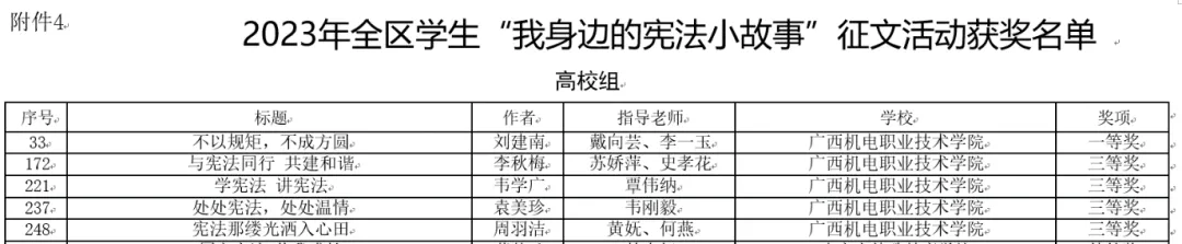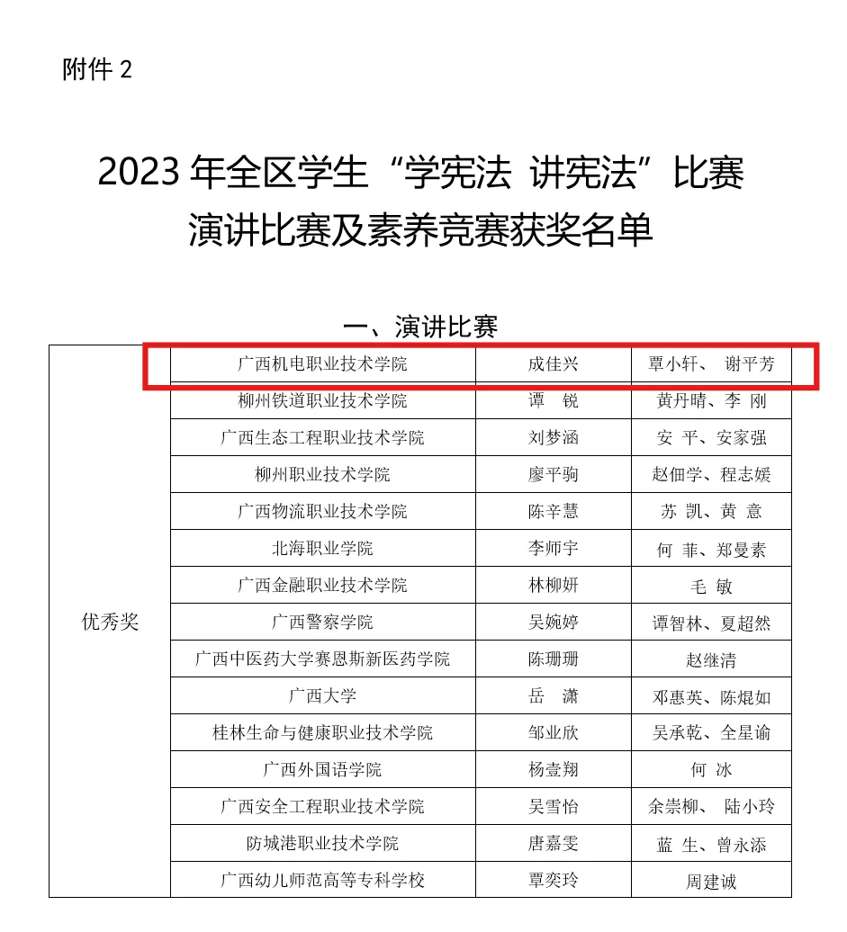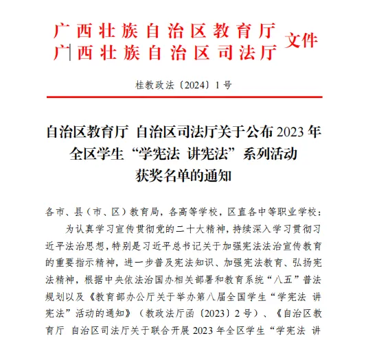 近日,广西壮族自治区教育厅、广西壮族自治区司法厅公布了2023年全区学生“学宪法 讲宪法”系列活动获奖名单,万象城官网荣获优秀组织奖,参赛学生在系列活动中斩获7项个人奖,其中一等奖1项,三等奖4项,优秀奖2项。