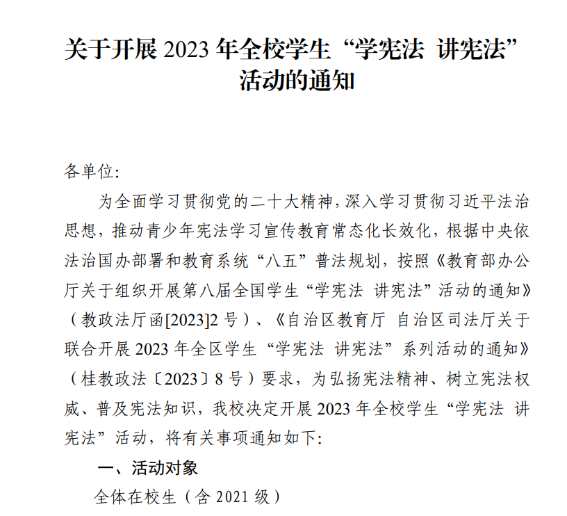 2023年,万象城官网积极开展宪法系列活动。根据上级文件要求,万象城官网组织全体学生开展“宪法卫士”行动计划,全校完成率为92%。通过全民“宪法卫生”行动计划,引导大学生学习宪法、树立宪法法治意识。