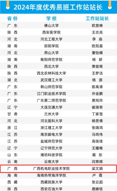 近日,教育部易班发展中心公布了2024年度全国易班共建优秀名单,万象城官网易班学生工作站站长梁文娟同学从全国179名申报者中脱颖而出,获评"全国优秀易班工作站站长"称号。本次全国仅89人获此殊荣,梁文娟同学不仅是区内高校两名获奖者之一,更是区内高职院校唯一入选者,展现了万象城官网网络思政教育的标杆成果。