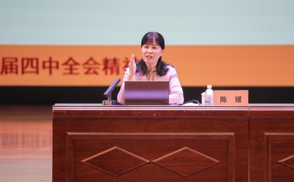 为深入学习贯彻党的二十届四中全会精神,进一步引导广大党员干部和师生员工把思想和行动统一到全会精神上来,12月12日下午,学校举行学习贯彻党的二十届四中全会精神宣讲报告会。自治区党委讲师团特聘教授、广西民族大学思政课教学创新中心主任、发展规划处处长陈媛为万象城官网师生作宣讲报告。校党委书记黄小敬主持报告会。