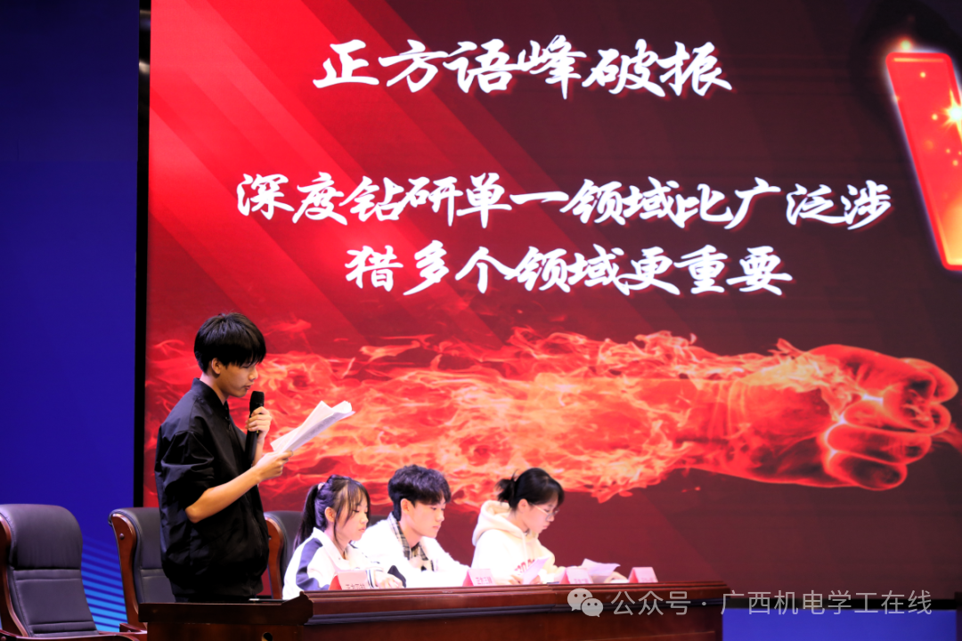 决赛现场气氛热烈而庄重,辩题紧扣当代大学生学习生活核心议题——“高校是否应该允许学生使用AI完成作业”“深度钻研单一领域是否比广泛涉猎多个领域更重要”,既呼应智能化时代教育新命题,又直击学风建设关键方向。比赛环节环环相扣,开篇立论时,正反方一辩提纲挈领、立场鲜明,为辩论筑牢逻辑基石;攻辩环节,双方二辩、三辩攻防有序,犀利提问与巧妙回应尽显敏捷思维;自由辩论阶段,辩手们引经据典、论证充分,攻防转换间彰显思辨智慧,将现场氛围推向高潮,每一次精彩发言都赢得全场阵阵掌声,充分展现了电子信息工程学院学子的思辨素养与表达风采。