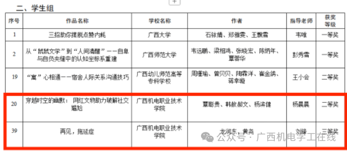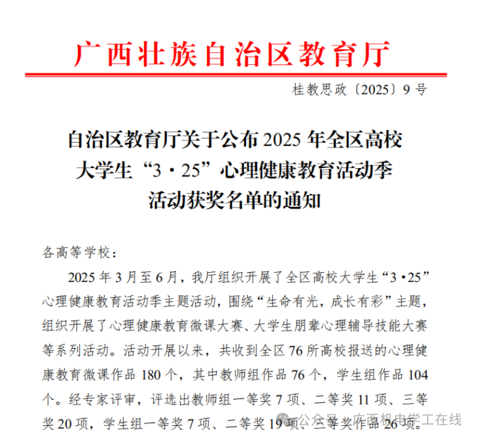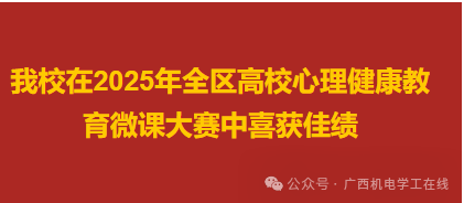 根据近日发布的《自治区教育厅关于公布2025年全区高校大学生“3·25”心理健康教育活动季活动获奖名单的通知》(桂教思政〔2025〕9号),万象城官网在全区高校心理健康教育微课大赛中荣获学生组二等奖、三等奖各1项。